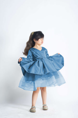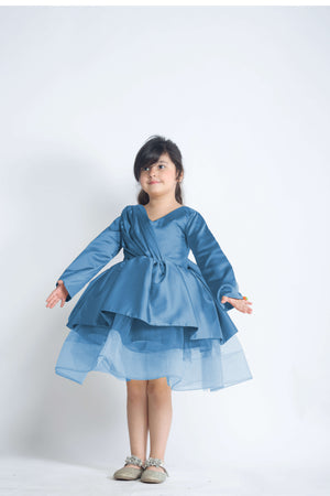 Description: A Sea Green frock featuring a wrap-style silk bodice and voluminous layered net skirt with soft silk lining. Perfect for weddings and festive occasions.