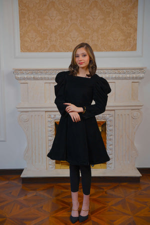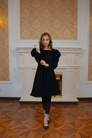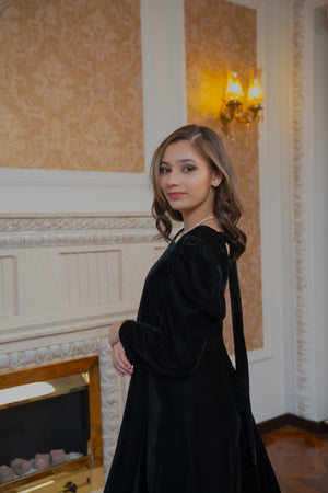 Description: A chic black velvet top with dramatic puffy sleeves and a sleek straight fit. Features a stylish open-back design with velvet strings for an adjustable knot. Perfect for formal evenings, parties, and special occasions.