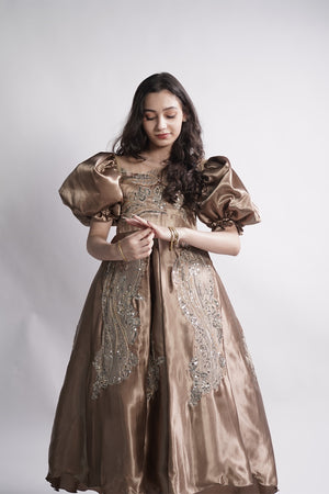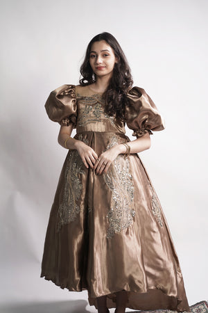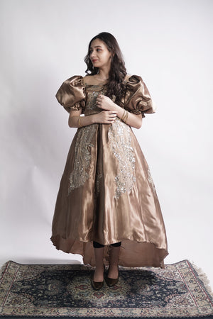 Description: A luxurious rose gold premium silk frock with puffy sleeves, a graceful back tail, and handcrafted cut daana work on the front and back. Ideal for weddings, parties, and special events.
