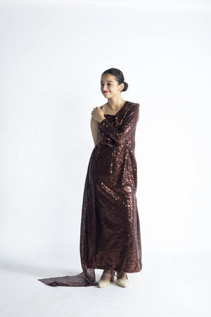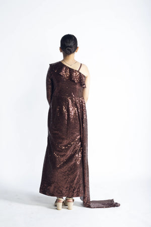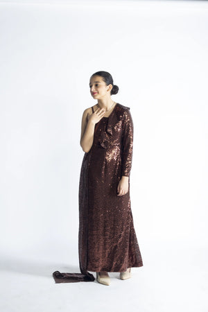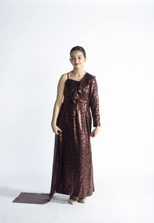 Description: A chocolate brown sequin gown with a one-shoulder design, fitted bodice, and full-length skirt. The dazzling fabric provides a dramatic, shimmering effect, perfect for formal events and special gatherings.