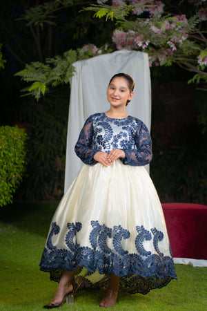 Description: A premium silk and net frock with navy blue embroidered bodice and sleeves, off-white net overlay, and soft silk lining. Designed with an elegant back tail and adjustable zip.