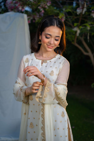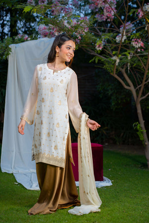 Dilan is a timelessly elegant ensemble featuring an ash white chiffon kurti delicately adorned with gold thread embroidery across the sleeves and body, finished with a heavily embroidered gold daaman that adds richness and grace. It is paired with a bronze silk sharara, providing structure and contrast. A matching ash white chiffon dupatta with gold embroidery on the borders completes this regal look?ideal for classic festive events and wedding soirées.