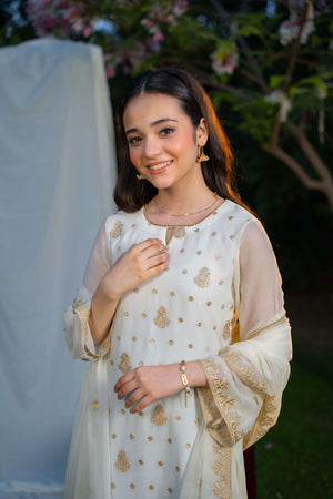 Dupatta: Ash White Chiffon with Gold Embroidered Borders