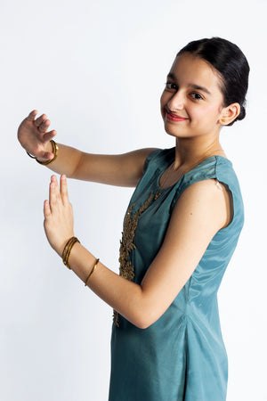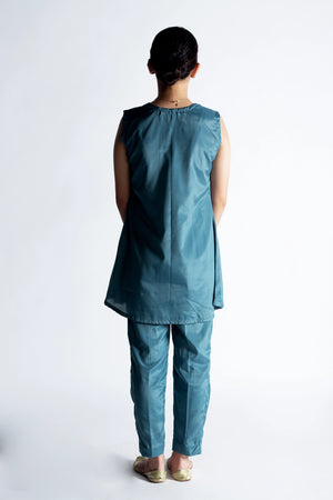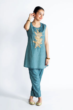 Elevate your style with our dark teal grip silk ensemble. The grip silk shirt features an elegant floral motif on the chest, paired with grip silk trousers.