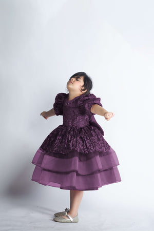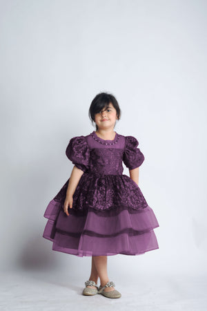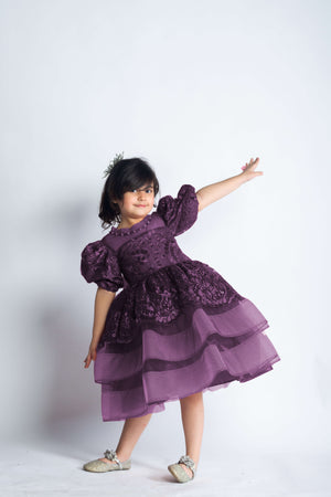 Description: A Plum embroidered net frock with puff sleeves, layered tulle skirt, and soft silk lining—ideal for birthdays and special celebrations.