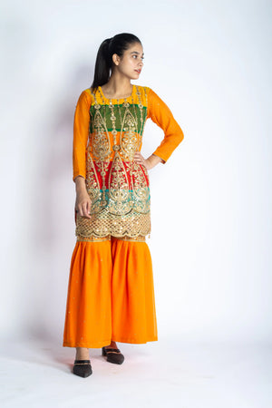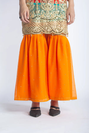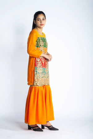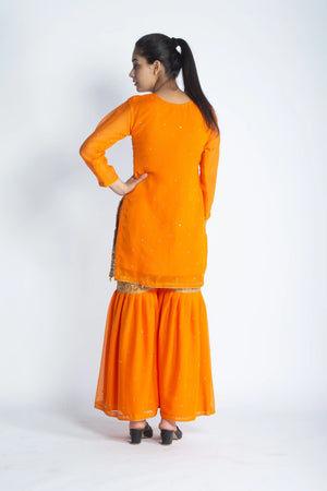 Brighten up any occasion with our orange chiffon shirt gharara set. The heavily embroidered and embellished shirt is adorned with mirror work, paired with a chiffon Gharara featuring heavy golden lace on the knees. This outfit offers a vibrant and stylish look, ideal for special events.