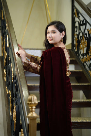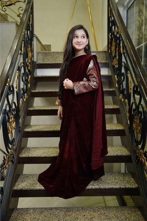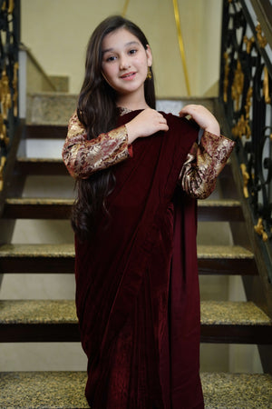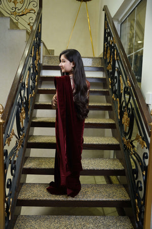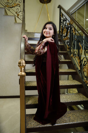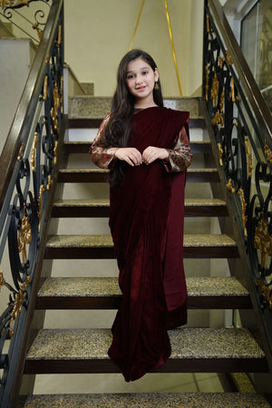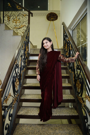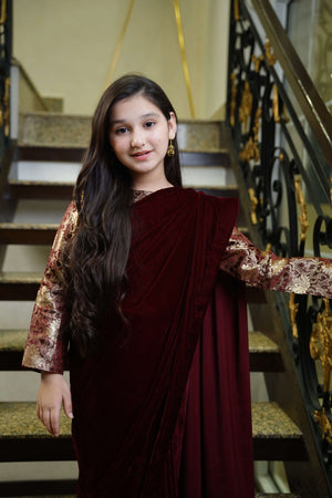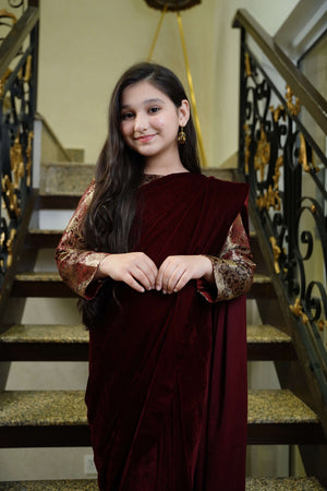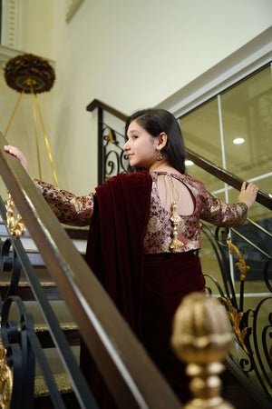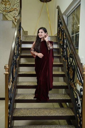 Description: A dark maroon velvet saree paired with a jamawar blouse featuring dori tussels and a circular back design. Ideal for weddings and formal occasions.