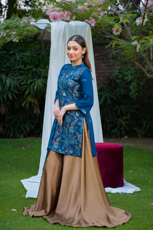 Zerifé is a sophisticated zinc-toned ensemble featuring a chiffon kurti with a ban neckline and loop detailing, adorned with bronze floral thread embroidery all over. It is paired with a flared bronze silk sharara, adding richness and volume. A matching zinc chiffon dupatta with bronze embroidery along the borders completes the look, offering a perfect blend of elegance and regality for festive occasions.