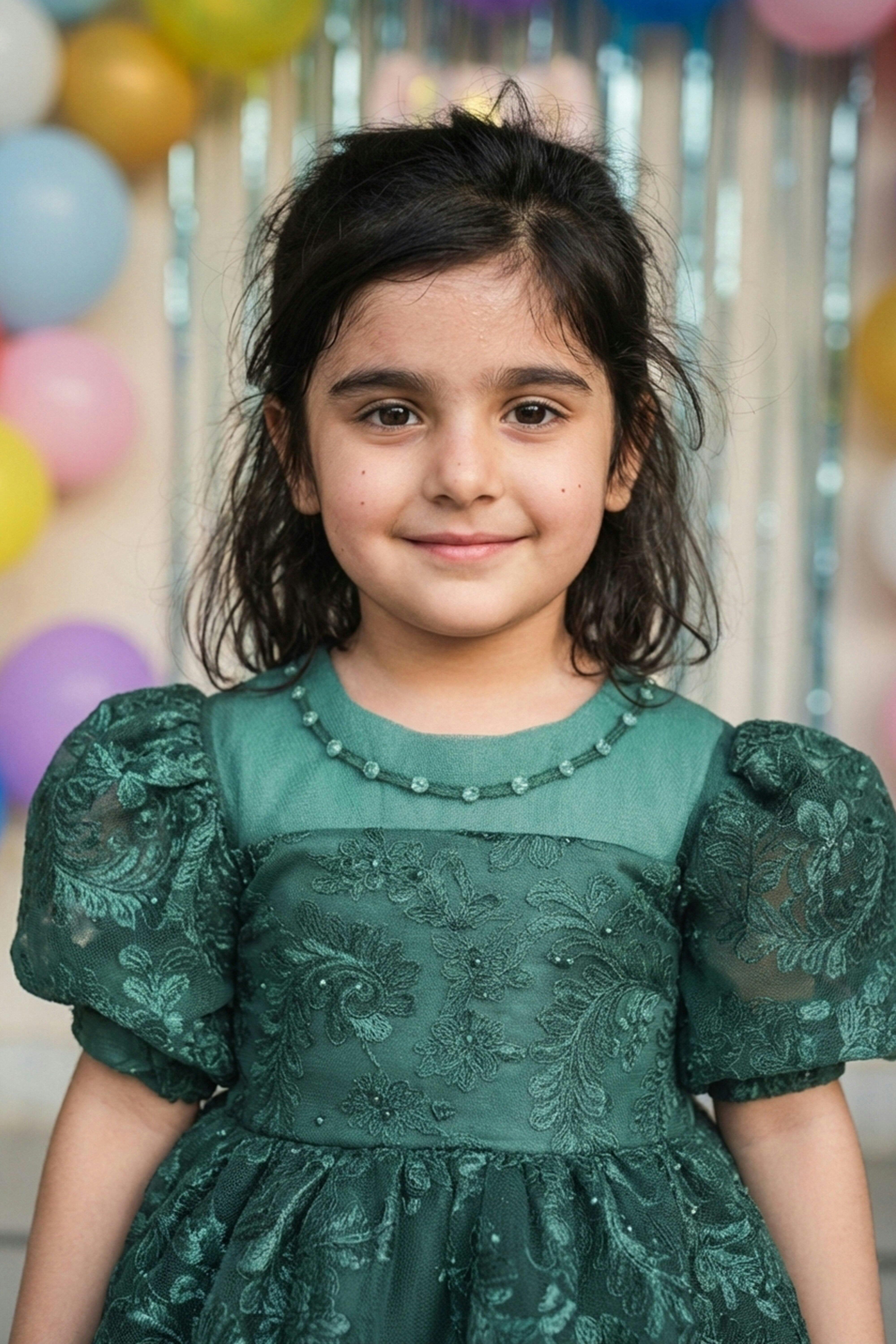 Description: A Sea Green embroidered net frock with puff sleeves, layered tulle skirt, and soft silk lining—ideal for birthdays and special celebrations.