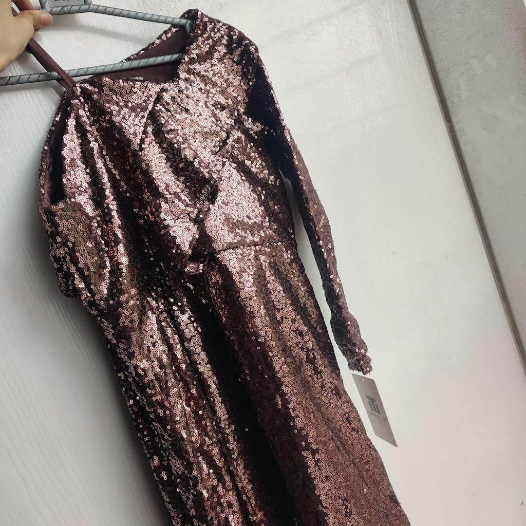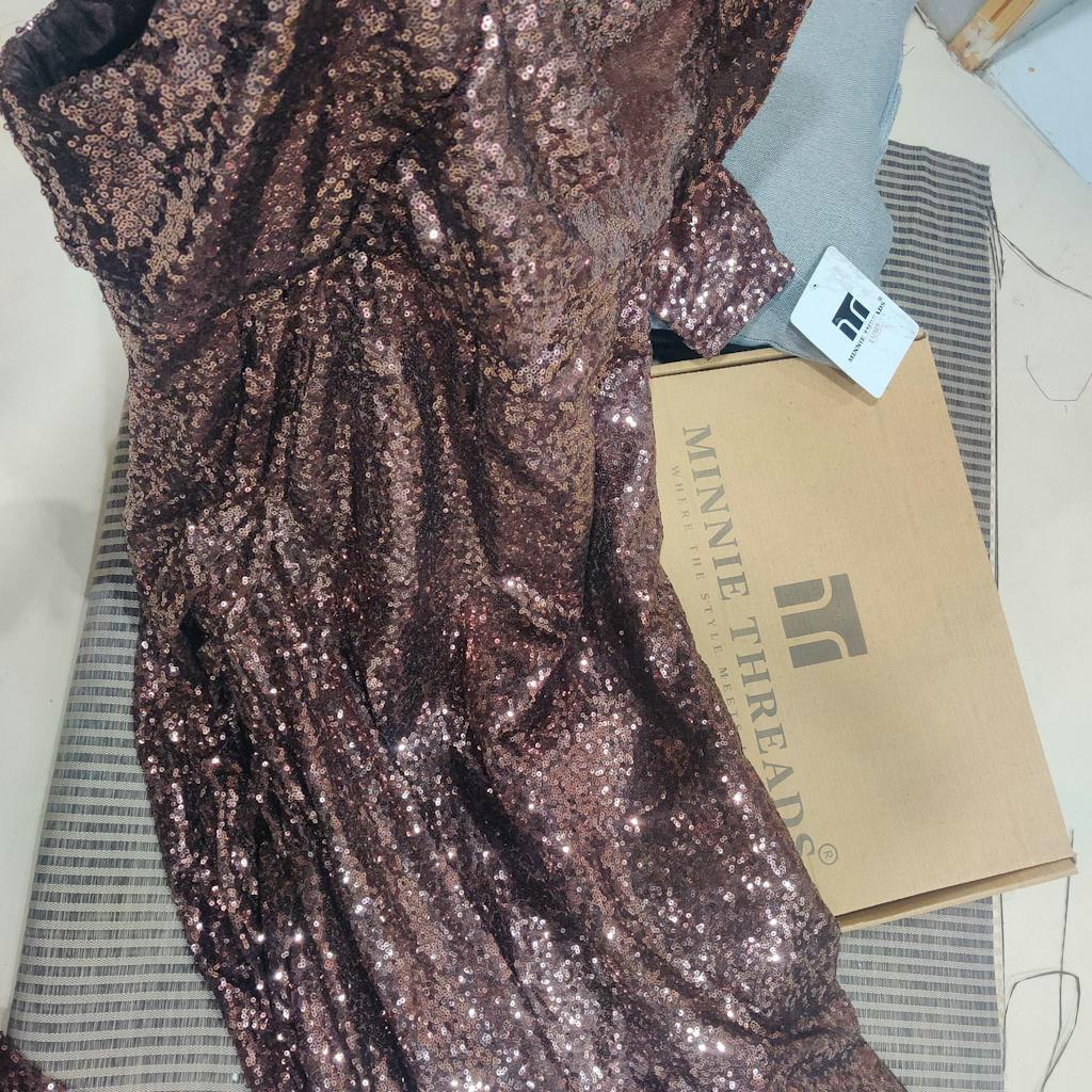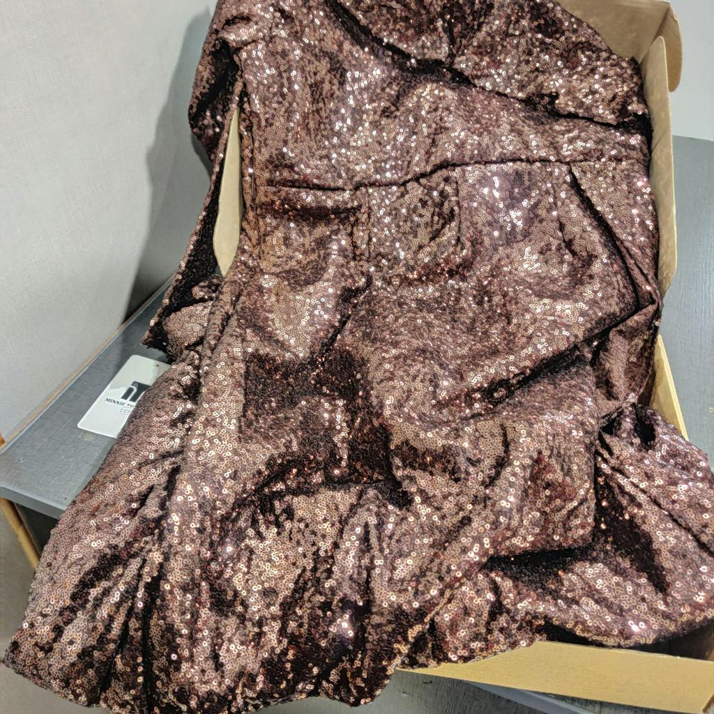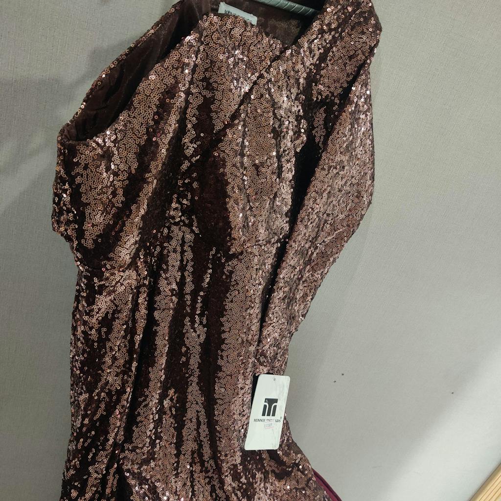 Description: A chocolate brown sequin gown with a one-shoulder design, fitted bodice, and full-length skirt. The dazzling fabric provides a dramatic, shimmering effect, perfect for formal events and special gatherings.