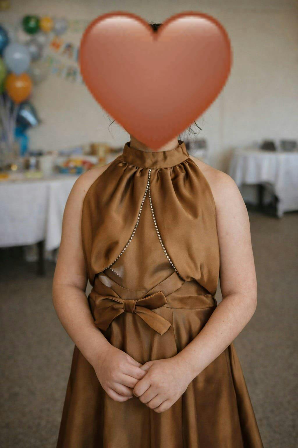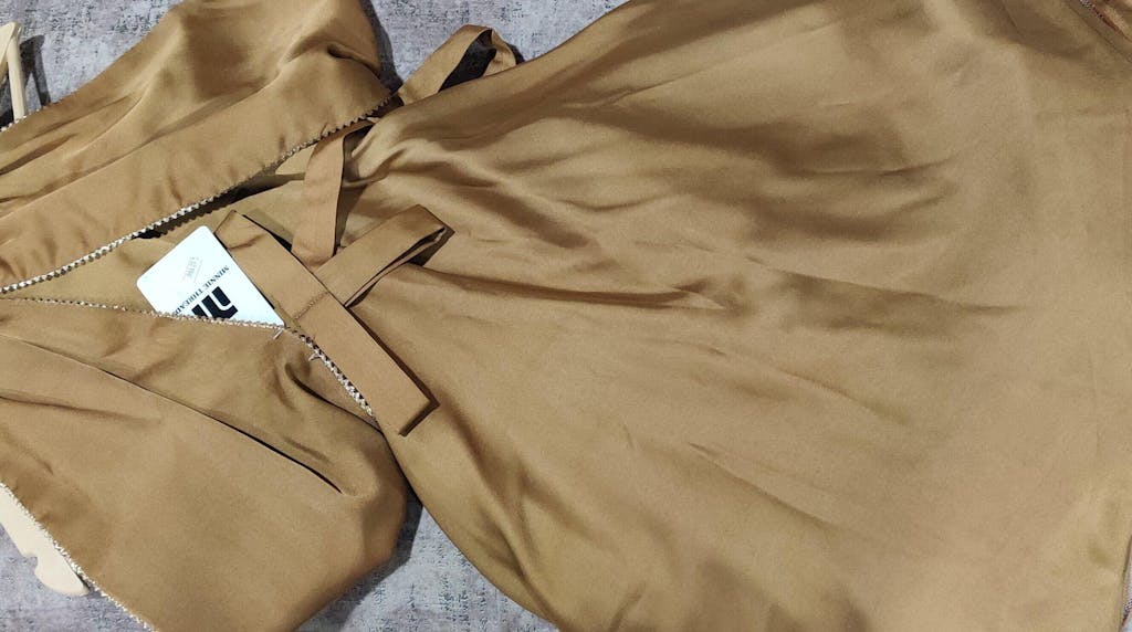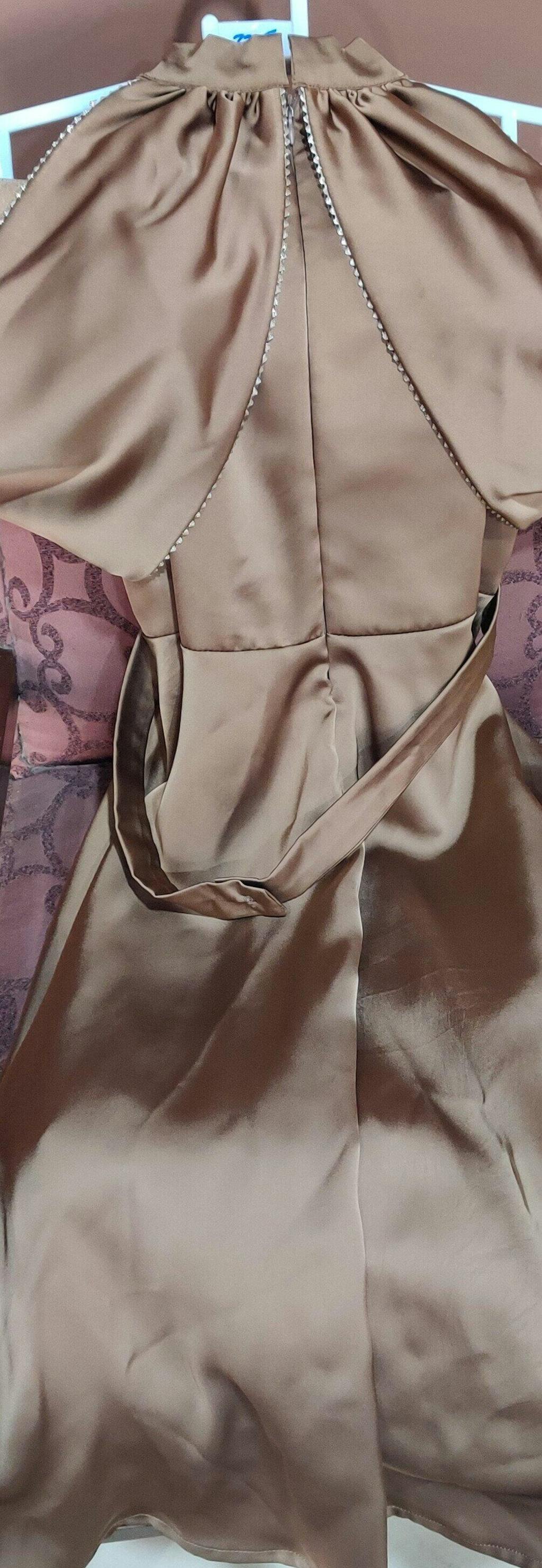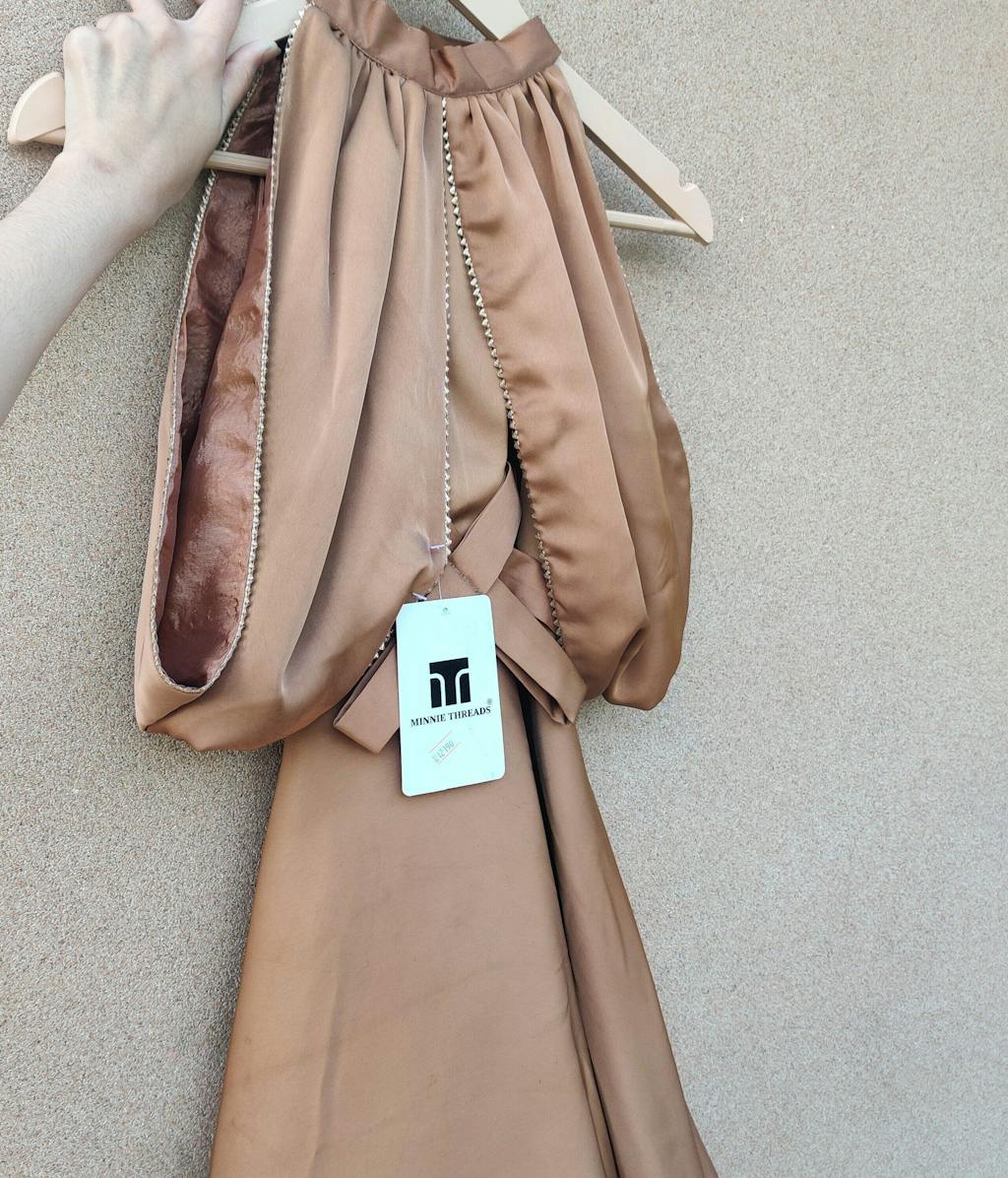 Description: Camel brown premium silk gown with pleated crossover bodice, structured sleeves, and A-line silhouette—perfect for formal and semi-formal events.