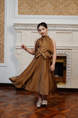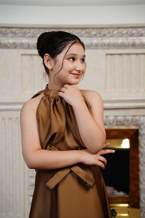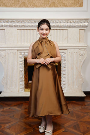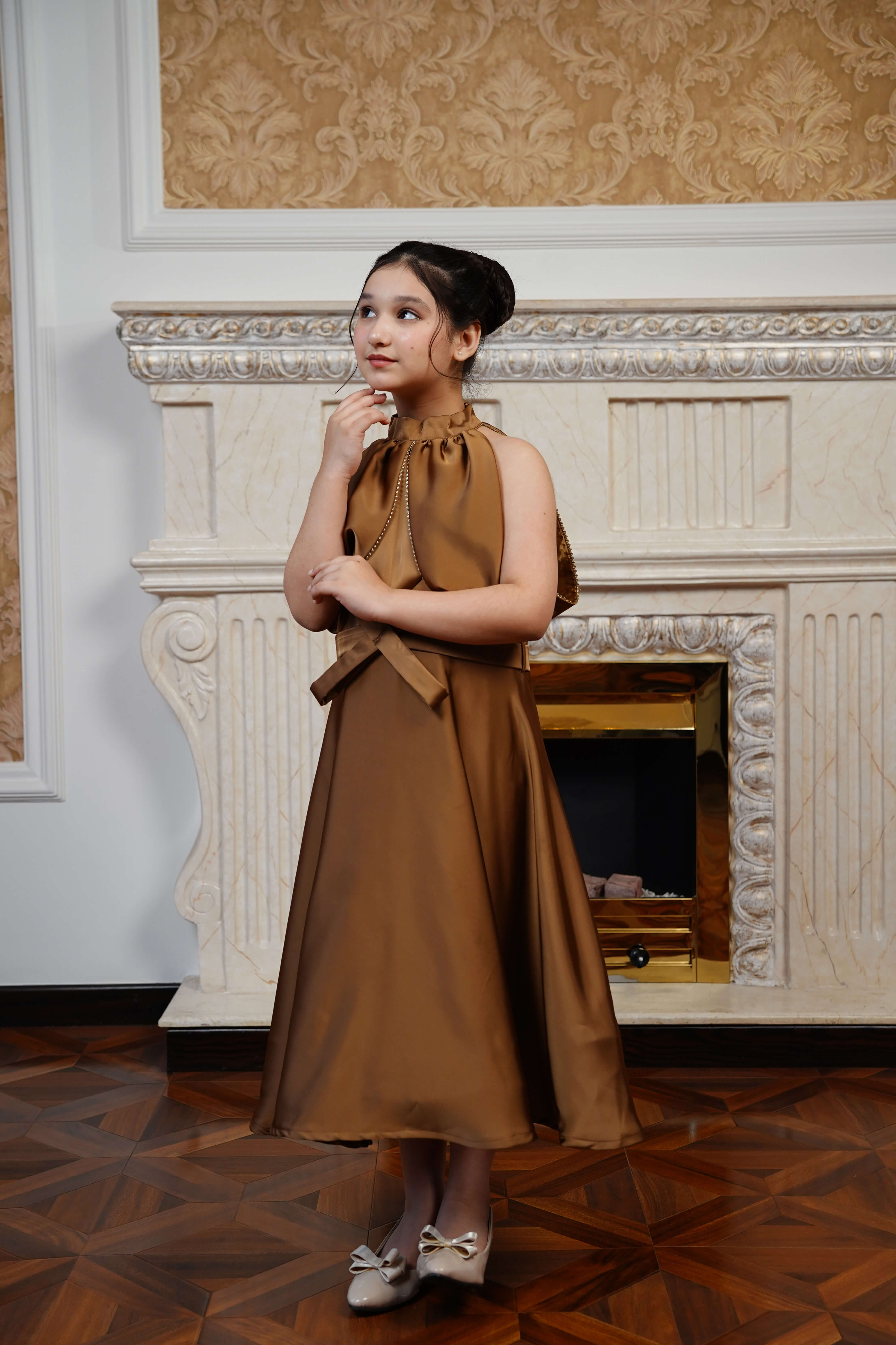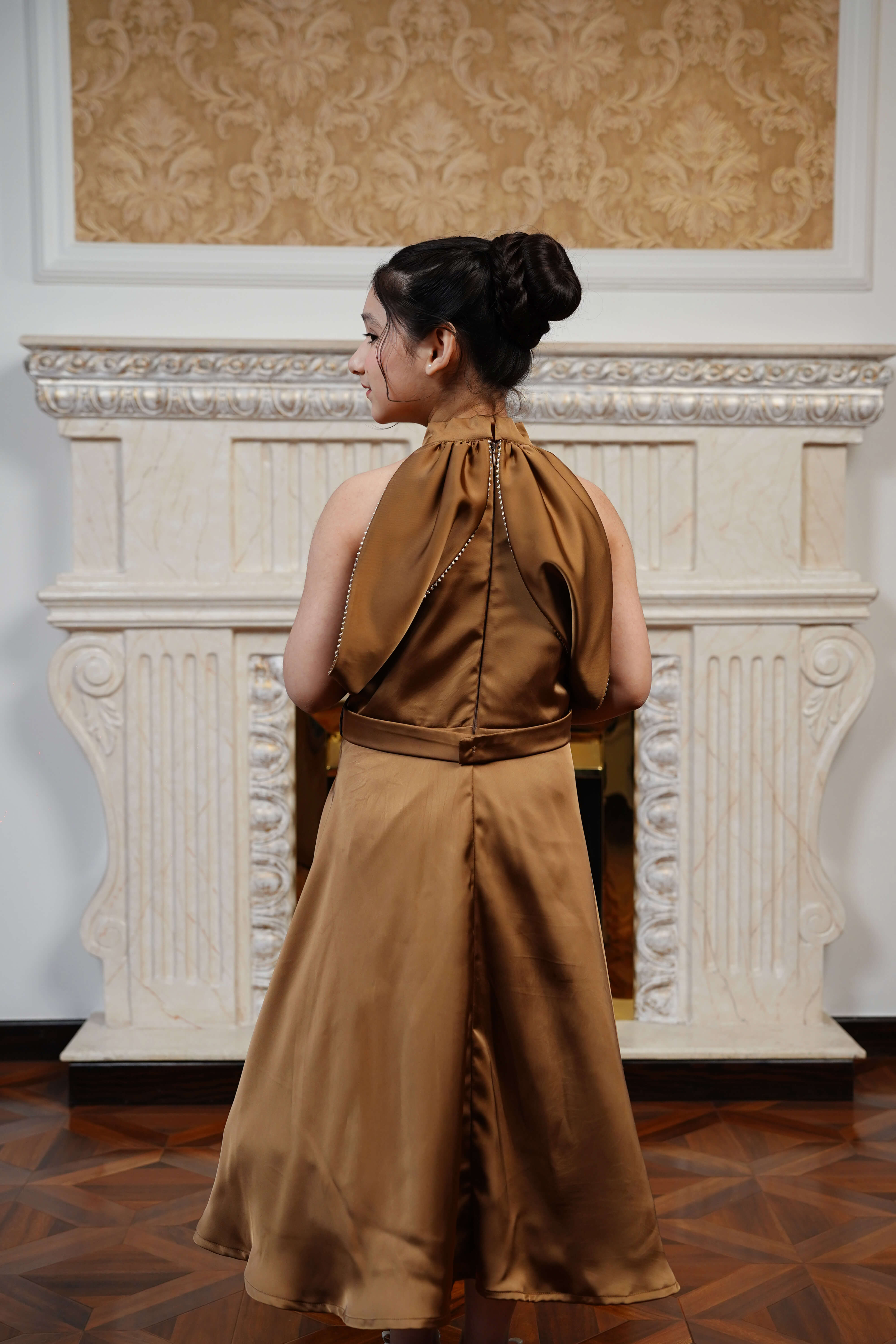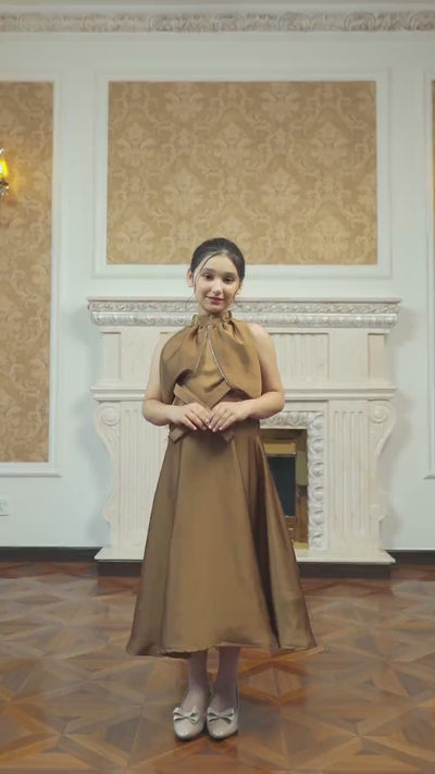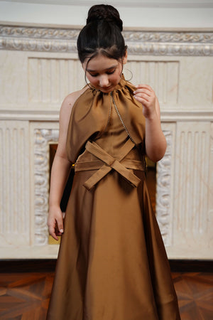 Description: Camel brown premium silk gown with pleated crossover bodice, structured sleeves, and A-line silhouette—perfect for formal and semi-formal events.