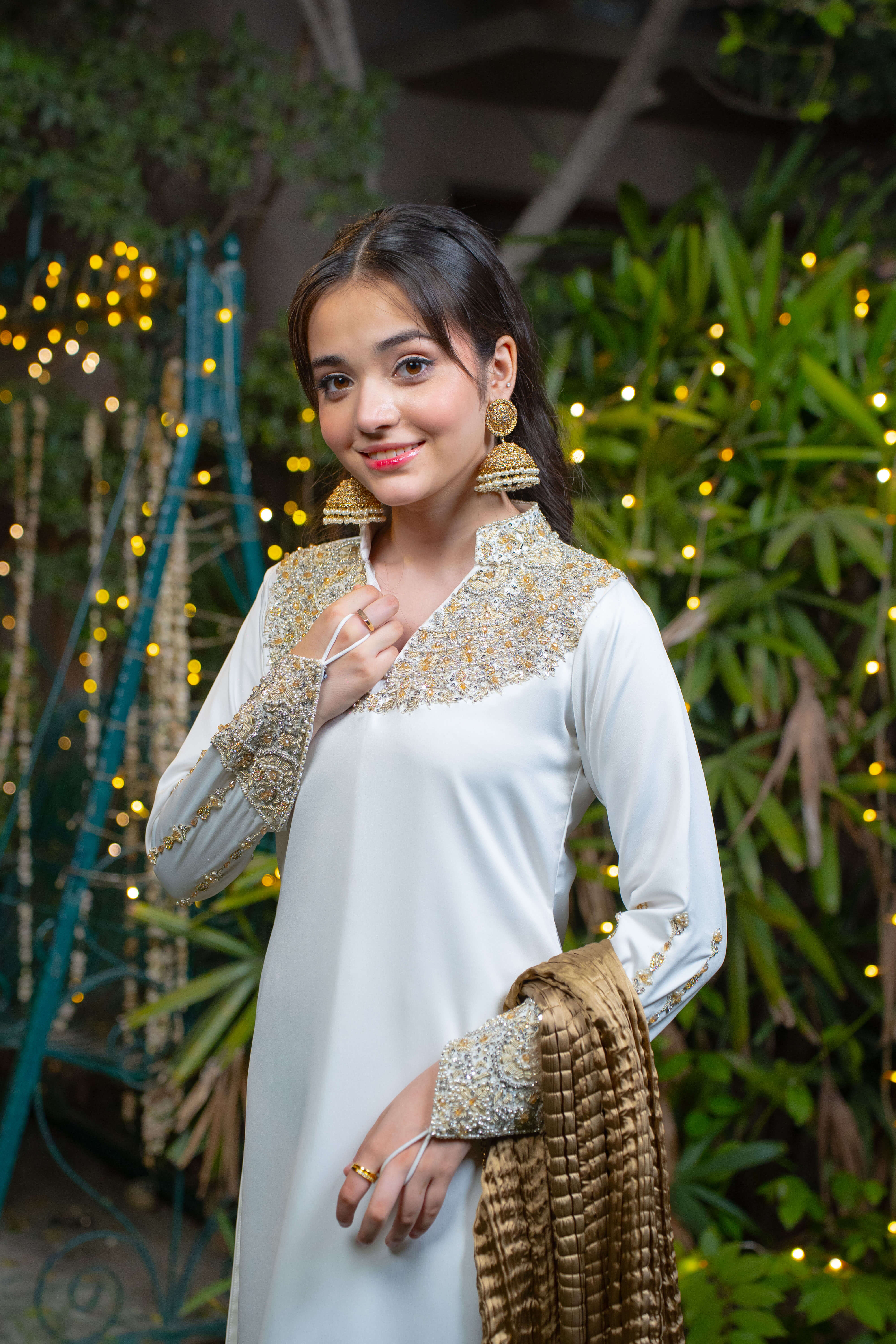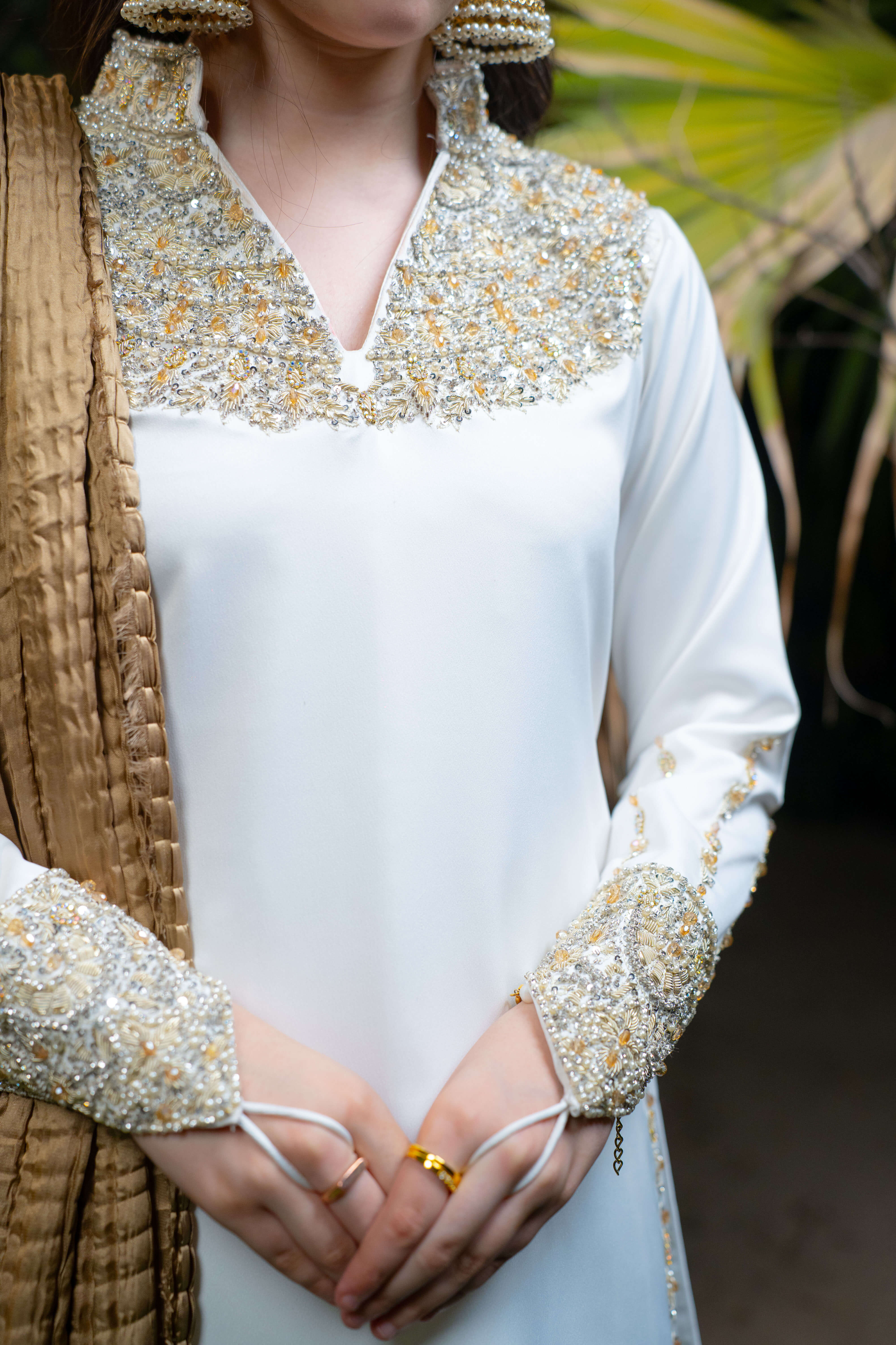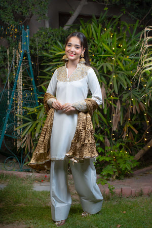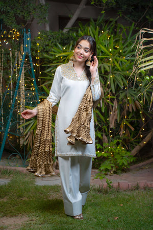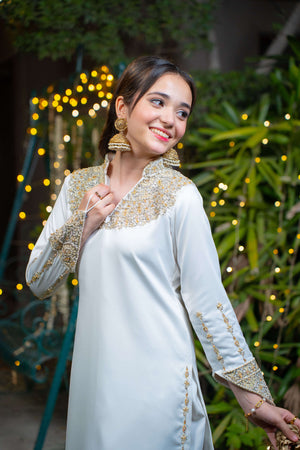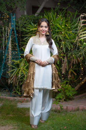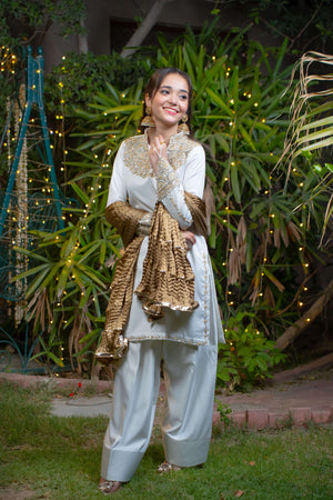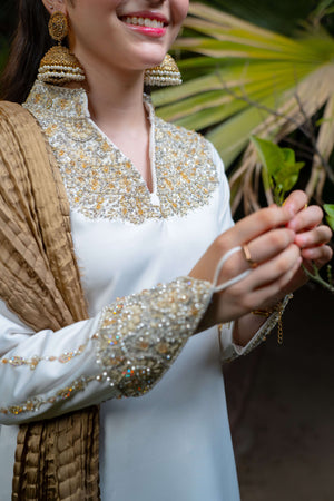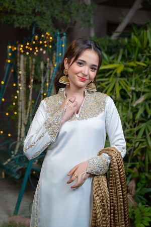 Yasemîn embodies purity wrapped in royalty. This graceful ensemble features a white imported silk shirt adorned with intricate adda work in soft champagne and light gold tones, highlighting the neckline, daaman, and long embellished sleeve motifs. Paired with a matching white farshi shalwar in silk and a bronze crushed dupatta detailed with three layers of gold lace.