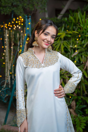 Shirt: White Imported Silk with Champagne & Light Gold Adda Work