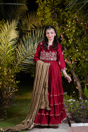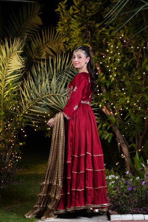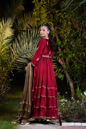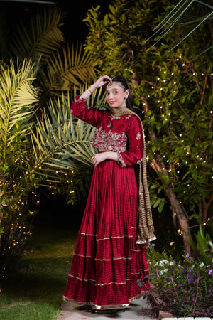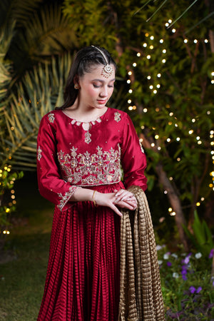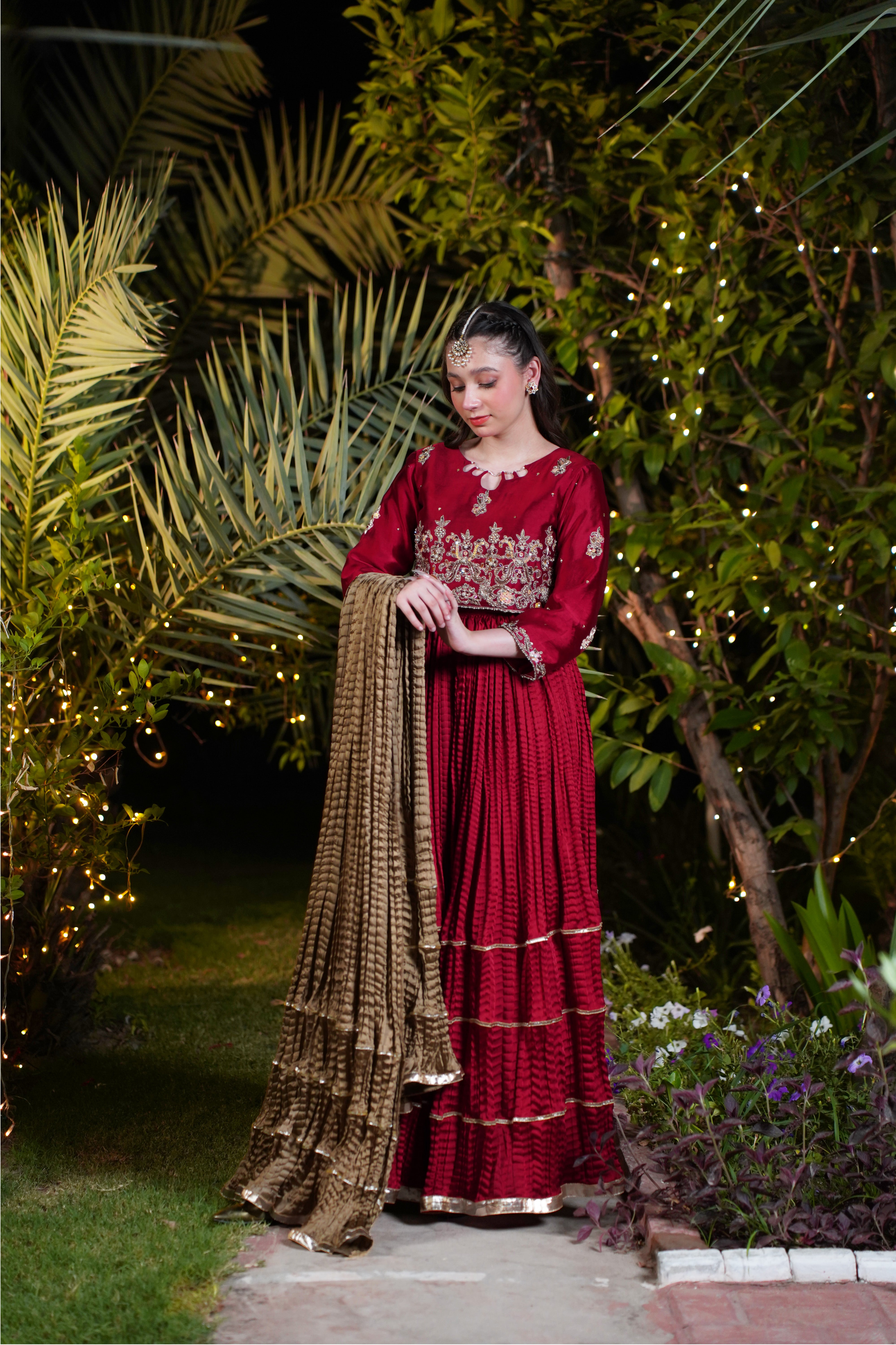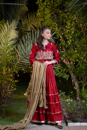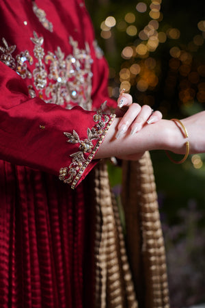 Zar Bakht is a portrait of regal elegance. The red choli, crafted from rich tissue silk, features intricate adda work with heavy embellishments along the waist for a defined, structured look. Paired with a red crushed lehenga adorned in layered gold lace and a matching crushed dupatta, this ensemble embodies grandeur with a bold, luxurious edge.