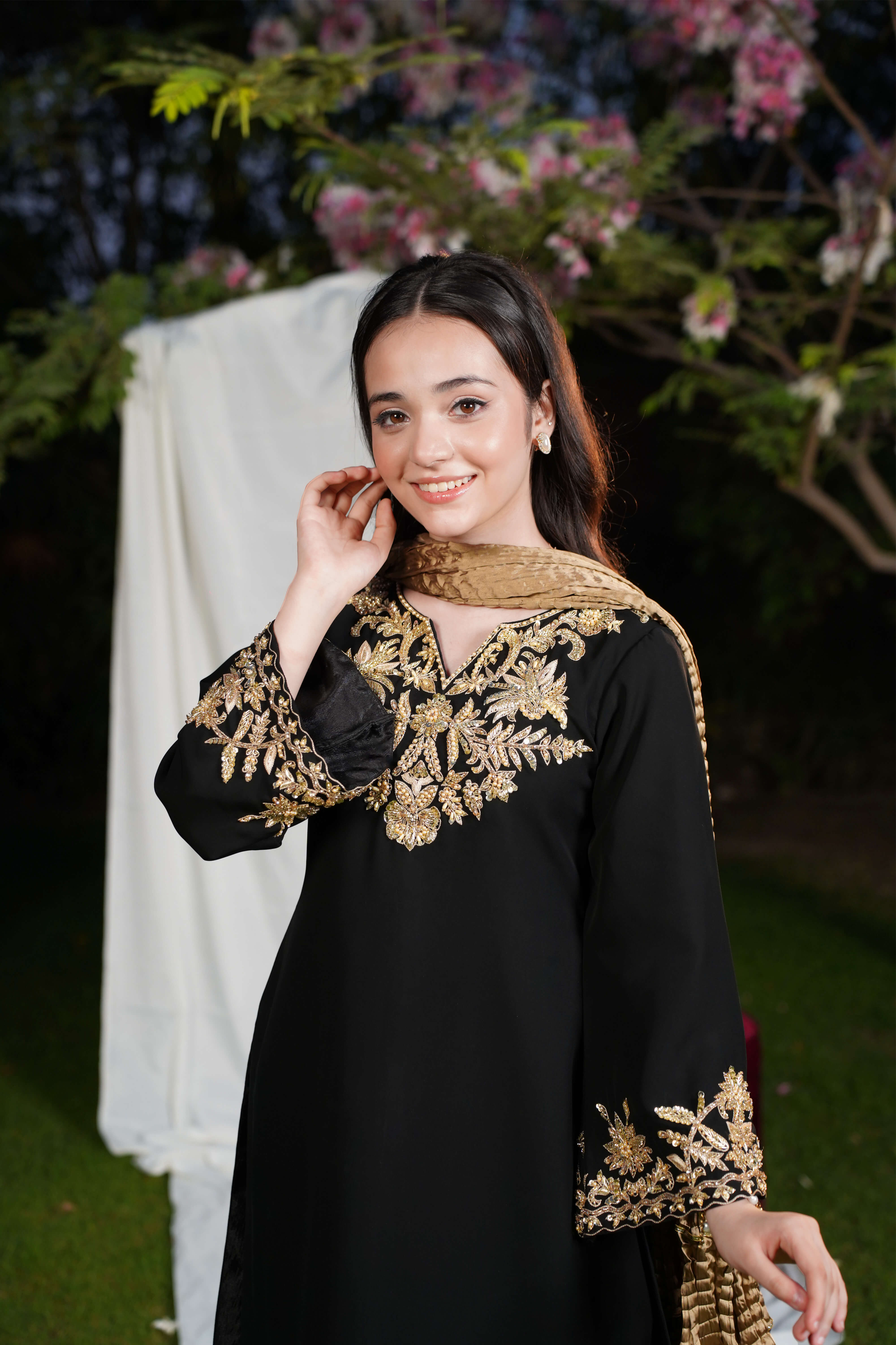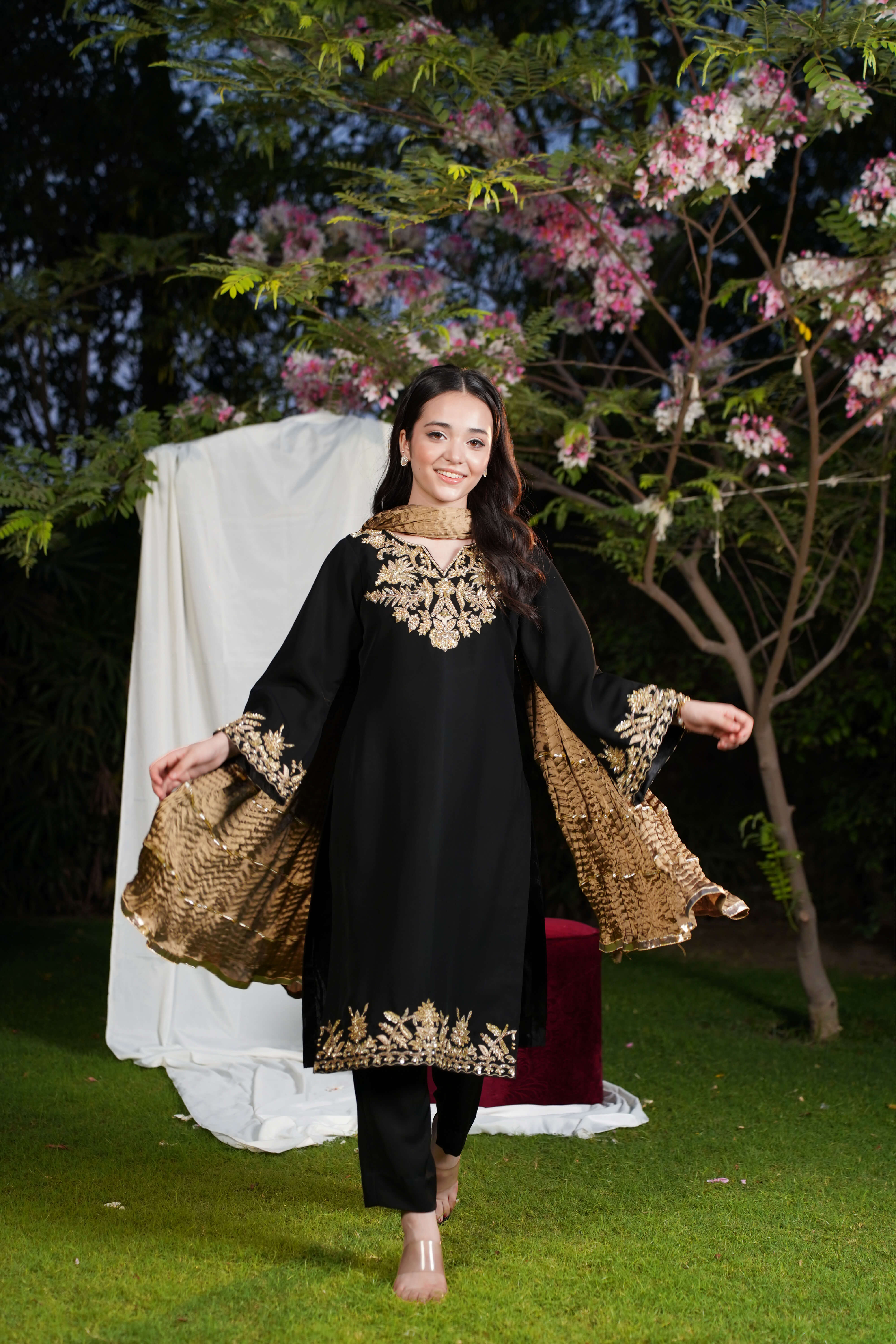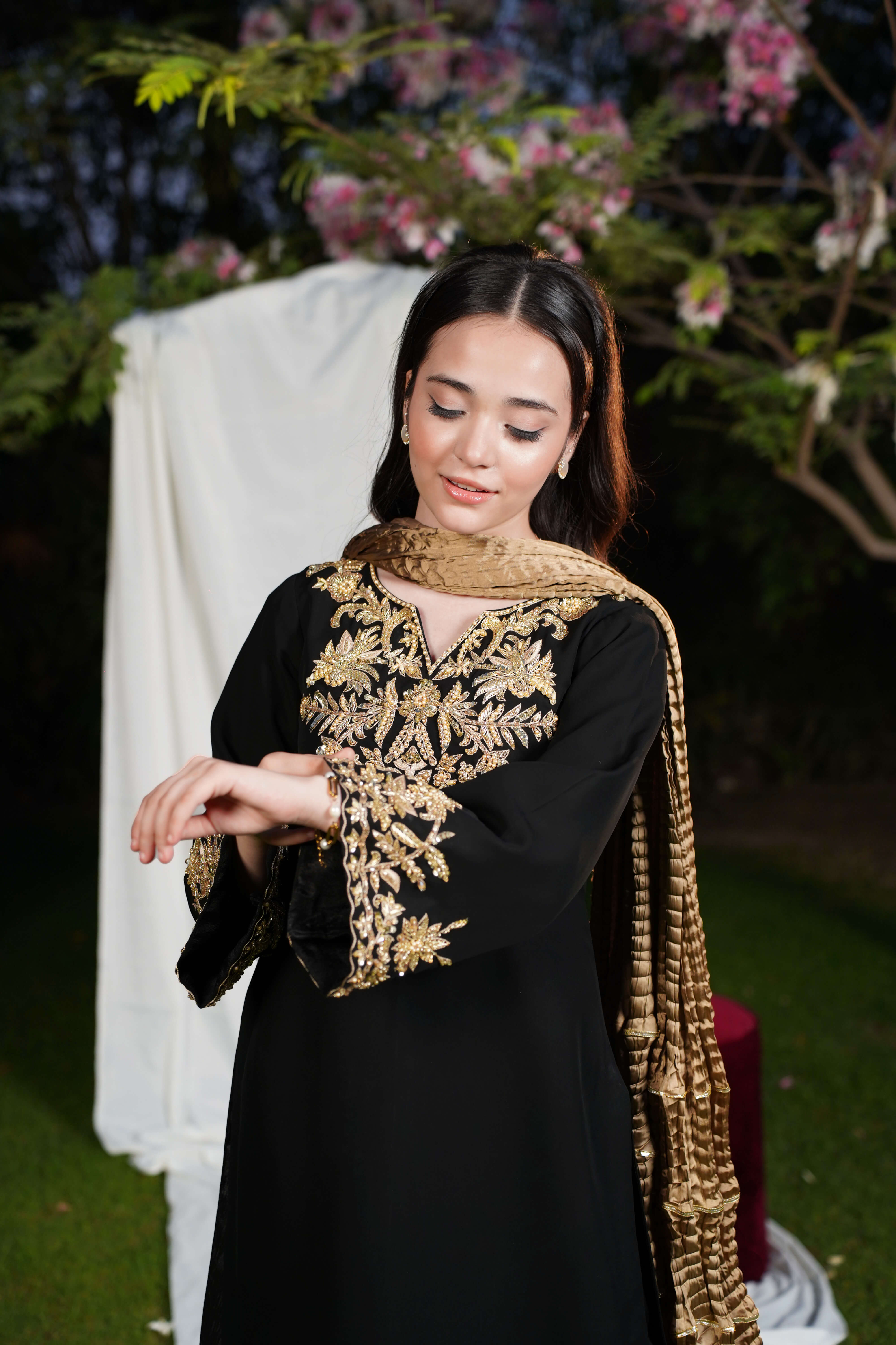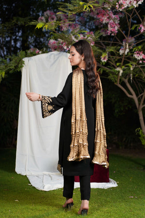 This regal black ensemble is a masterpiece in adda craftsmanship, featuring a Korean silk shirt with a heavily embellished neckline and bell sleeves, lavishly adorned with intricate adda work in bronze tones. The daman is richly embroidered, adding depth and dimension to the design. It is paired with a jet black Korean silk fit trouser, creating a sharp silhouette. The look is elevated with a bronze crushed dupatta, embellished with three layers of ornate gold lace, making it undeniably royal and perfect for grand occasions.