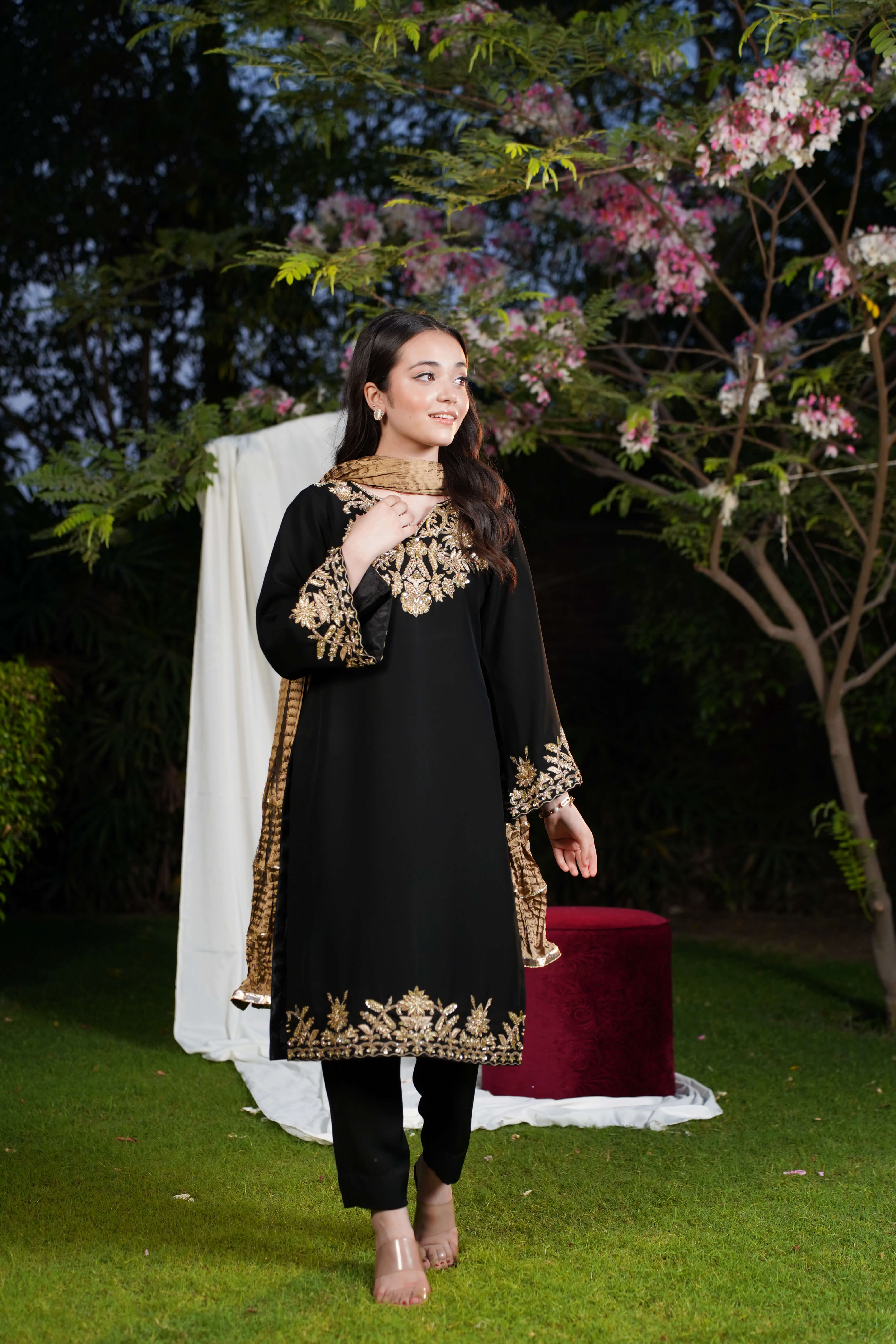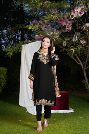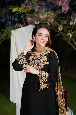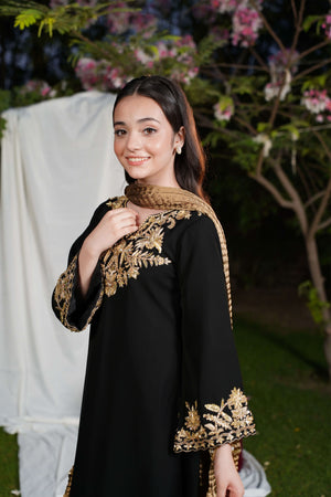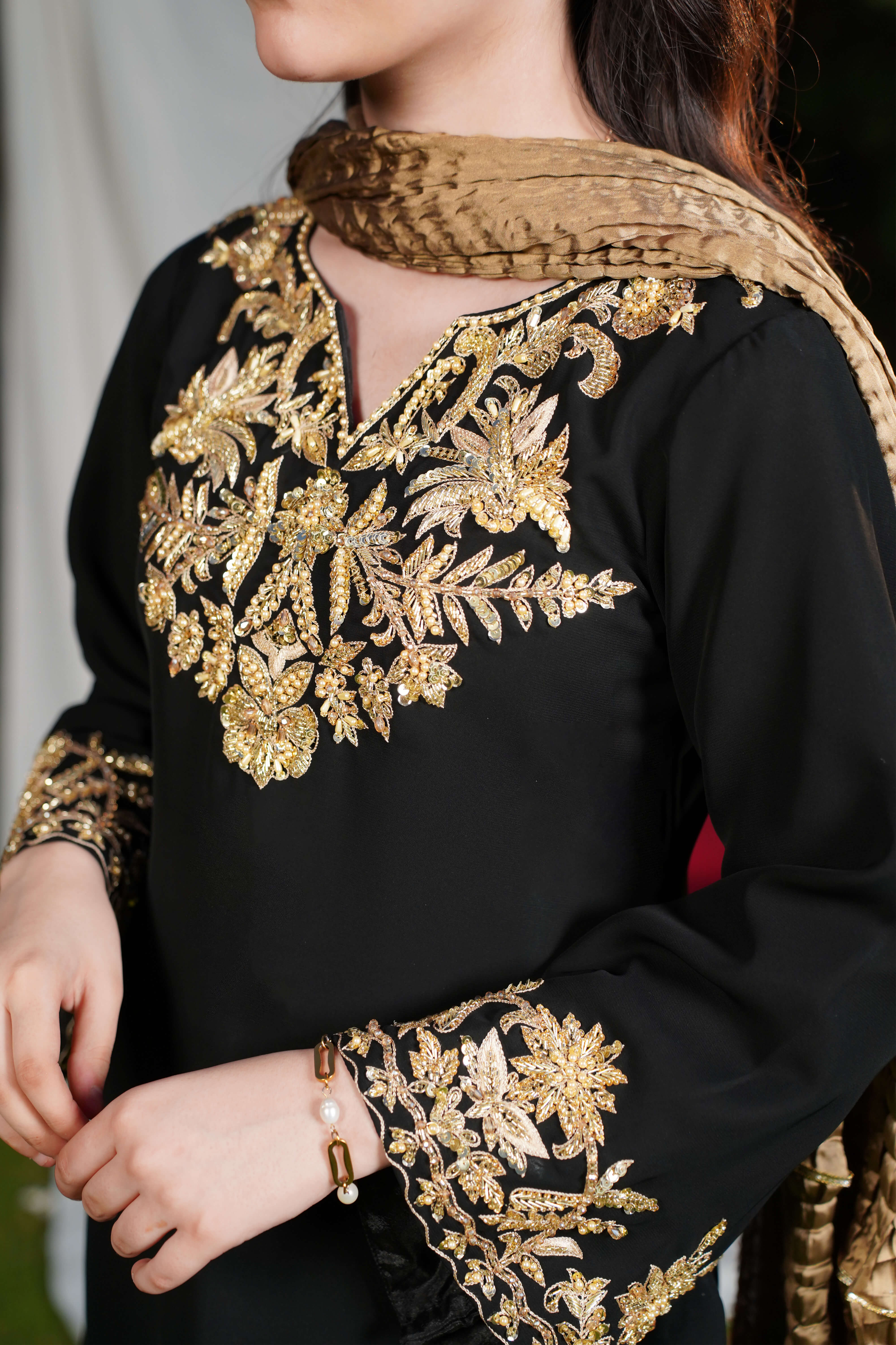 This regal black ensemble is a masterpiece in adda craftsmanship, featuring a Korean silk shirt with a heavily embellished neckline and bell sleeves, lavishly adorned with intricate adda work in bronze tones. The daman is richly embroidered, adding depth and dimension to the design. It is paired with a jet black Korean silk fit trouser, creating a sharp silhouette. The look is elevated with a bronze crushed dupatta, embellished with three layers of ornate gold lace, making it undeniably royal and perfect for grand occasions.