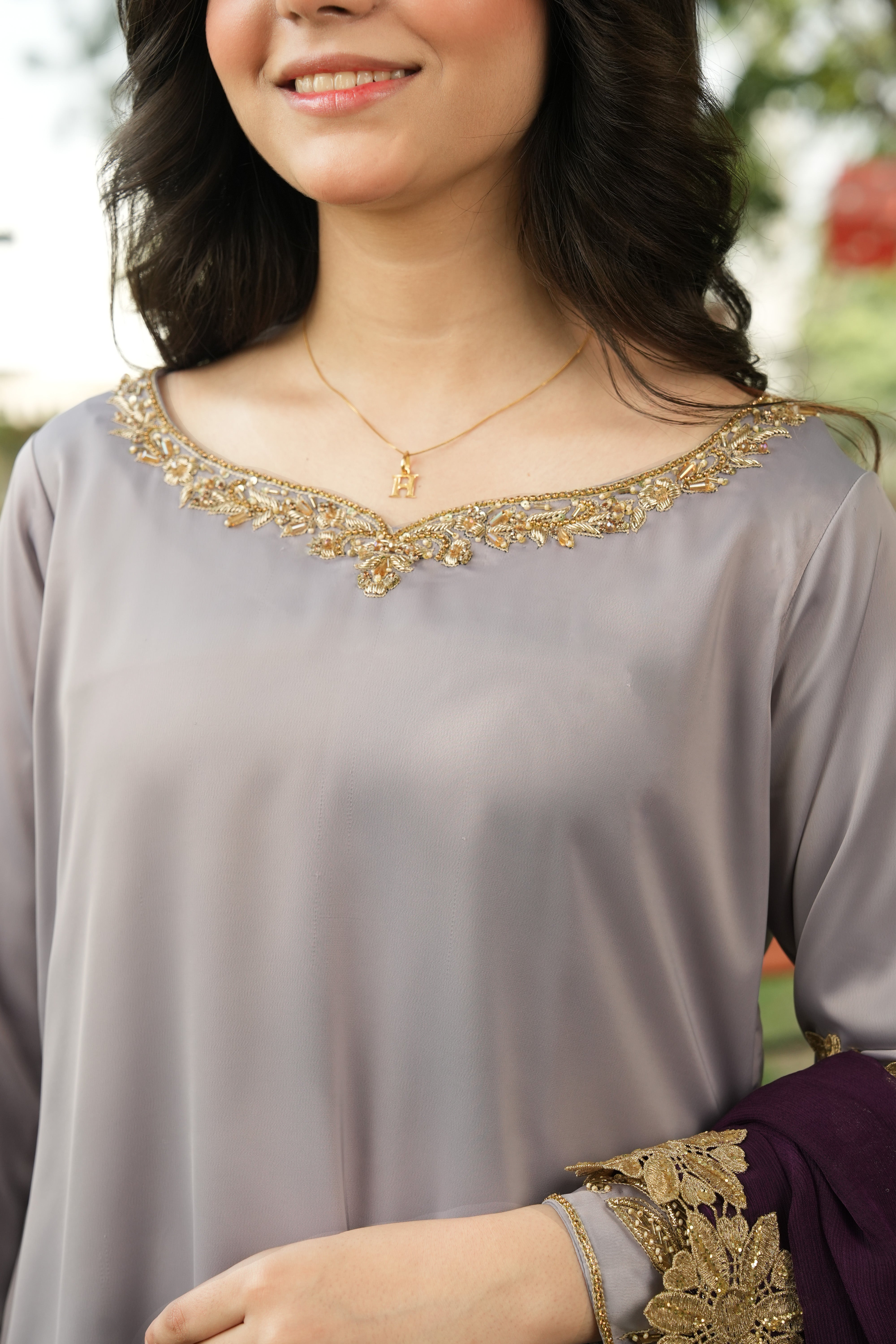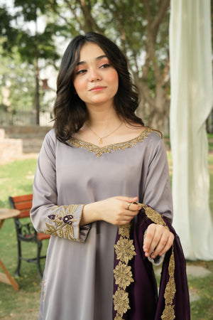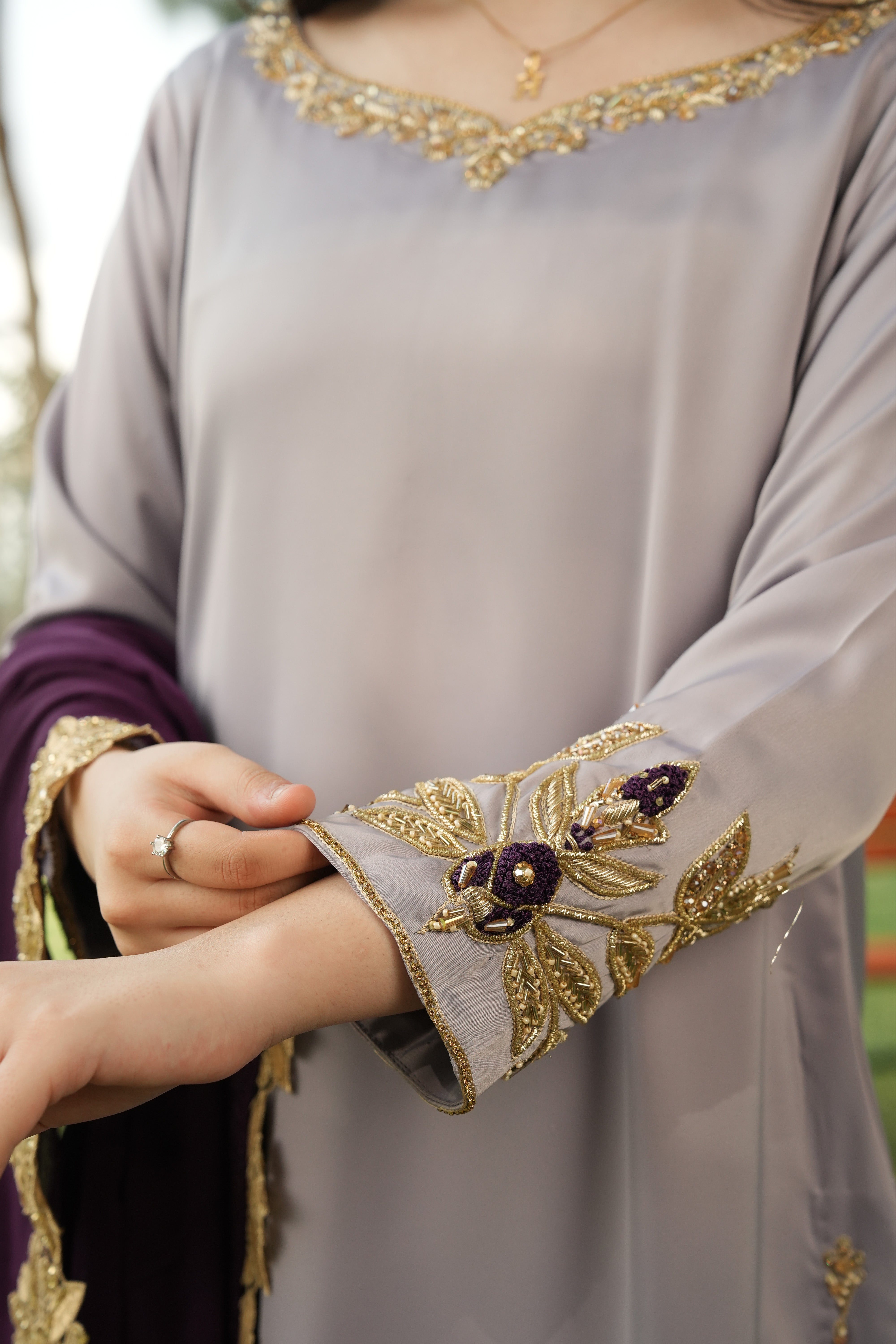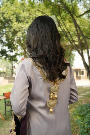 Shirt: A light lavender Korean silk shirt adorned with elegant bails of adda work on the neckline (front and back) and slight daaman borders. The sleeves feature heavy floral dabka with dark plum and light gold naqshi detailing, finished with statement dori tassels at the back.