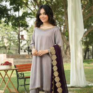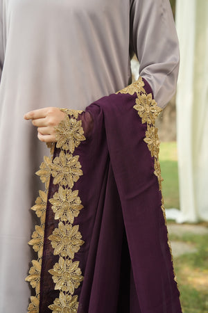 Dupatta: Dark plum chiffon dupatta enhanced with large, elegant floral lace on all four sides for a bold contrast.
