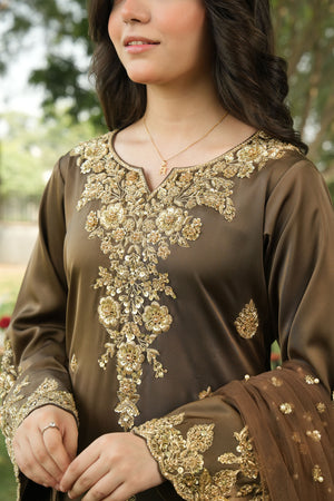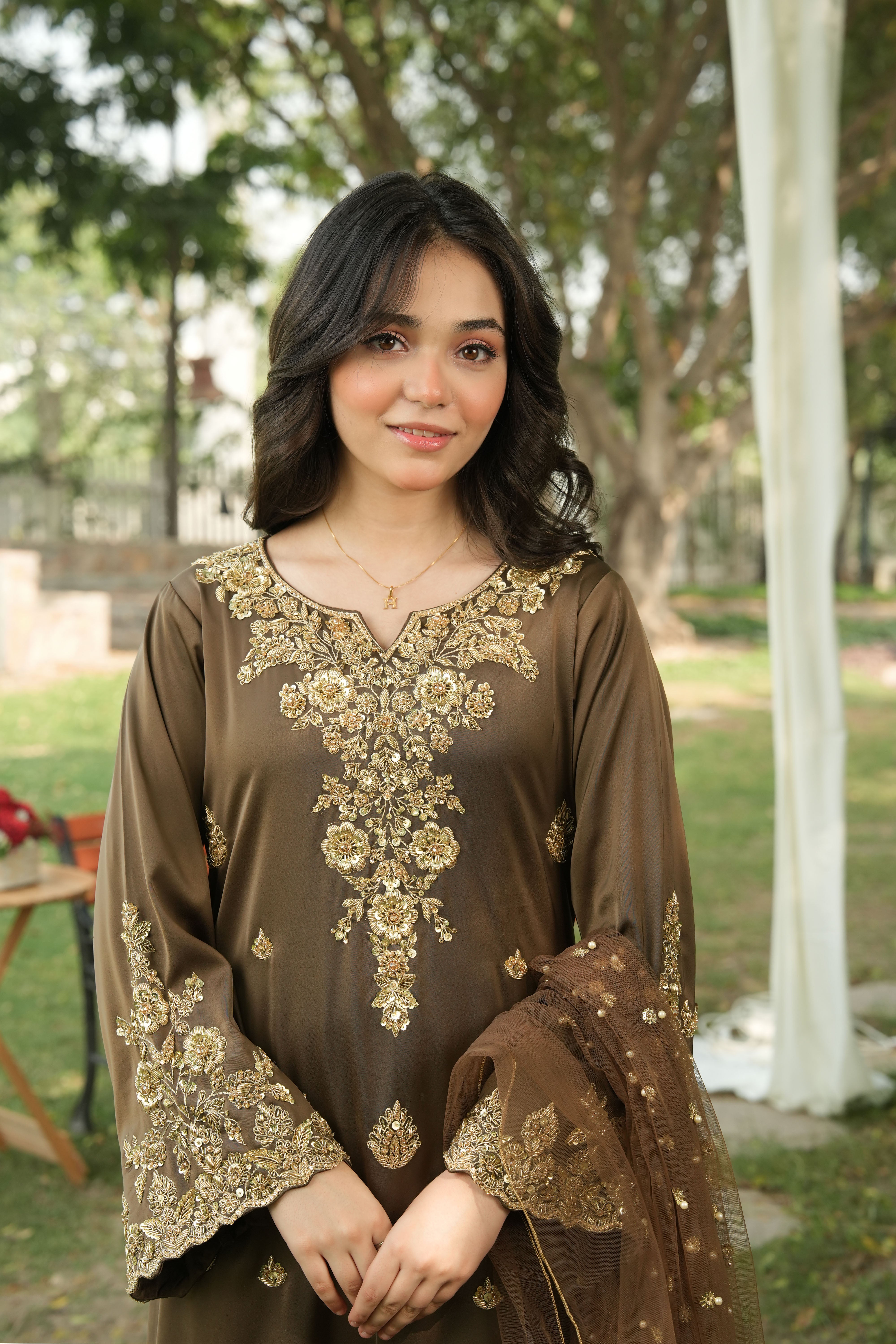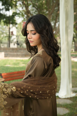 Shirt: A majestic smoky brown shirt adorned with light gold adda work, featuring dabka floral motifs beautifully spread across the neckline and bell sleeves. The daaman is richly decorated with a golden bail pattern and scattered dabka flowers, exuding unmatched opulence and artistry.