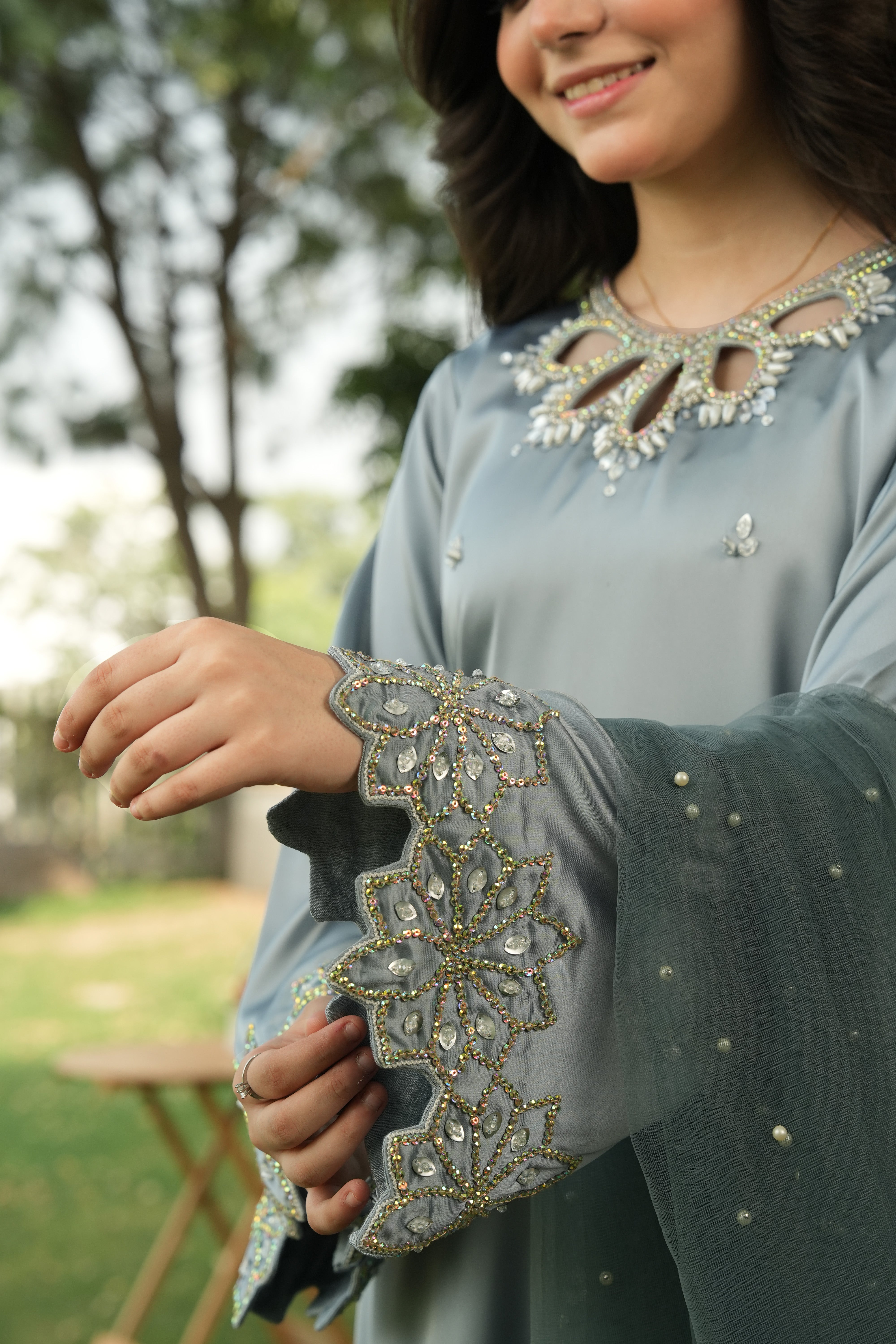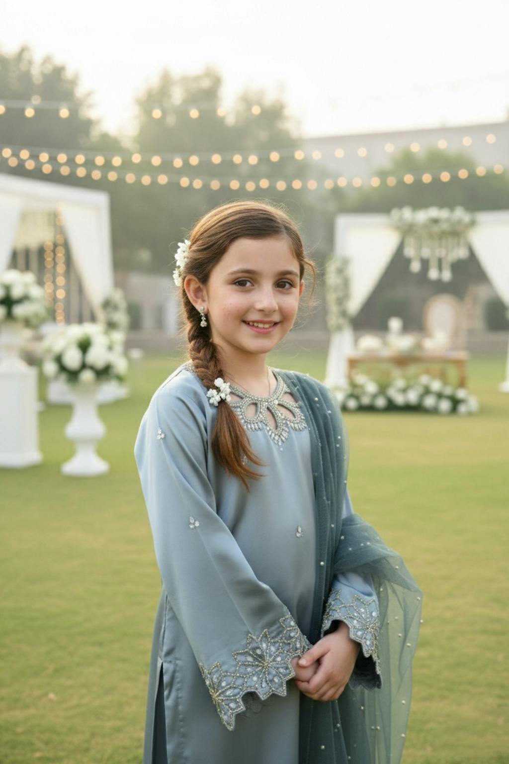 A breathtaking icy blue ensemble that blends sophistication with delicate artistry. The multicolor floral stonework and shimmering details make Noor Jahan a timeless choice for festive and formal occasions.