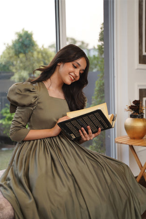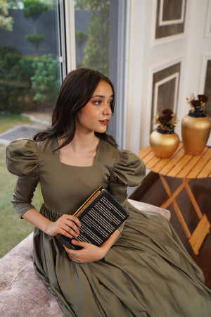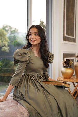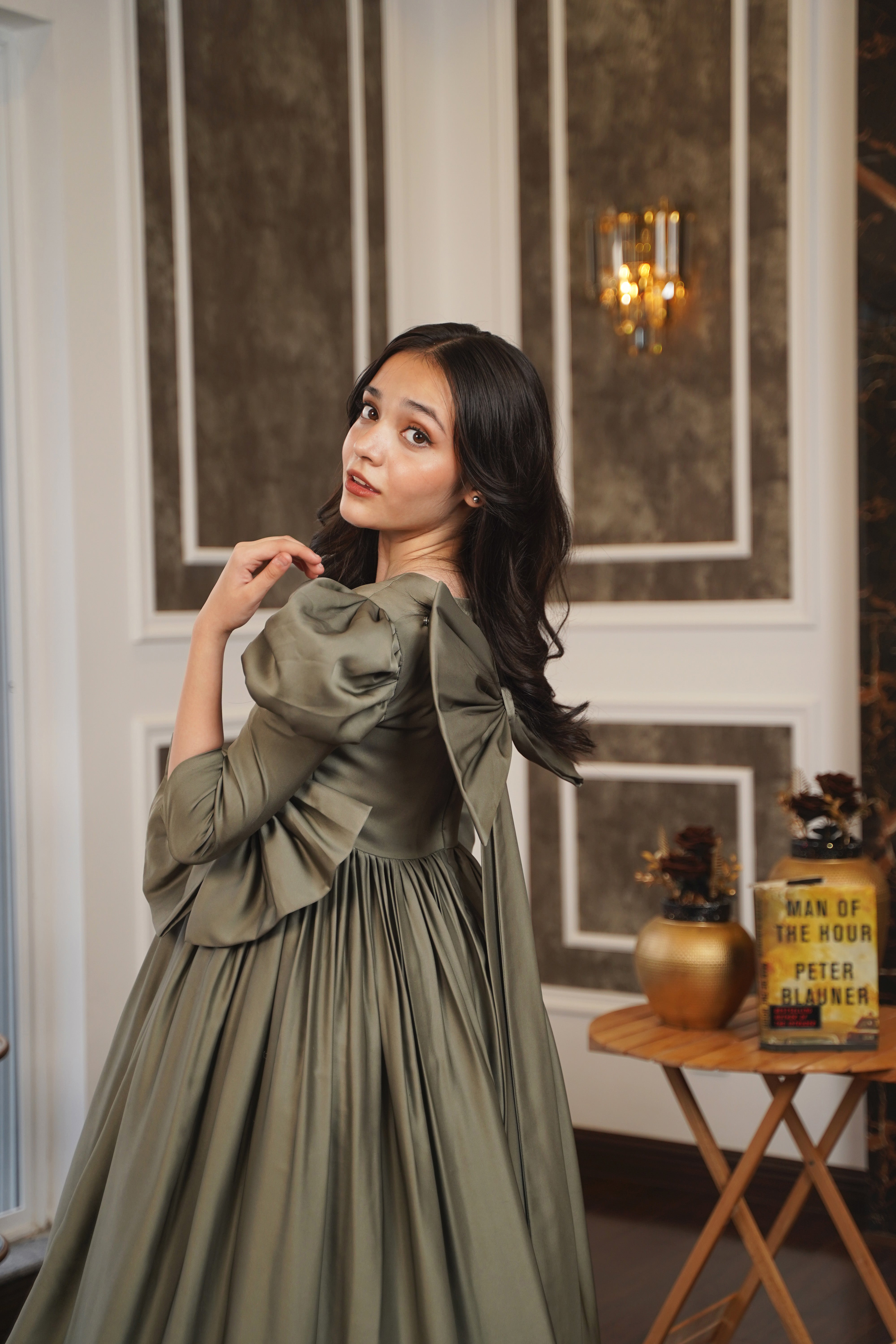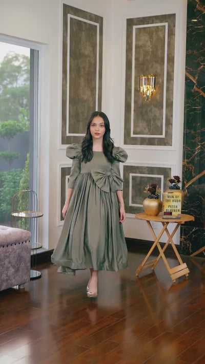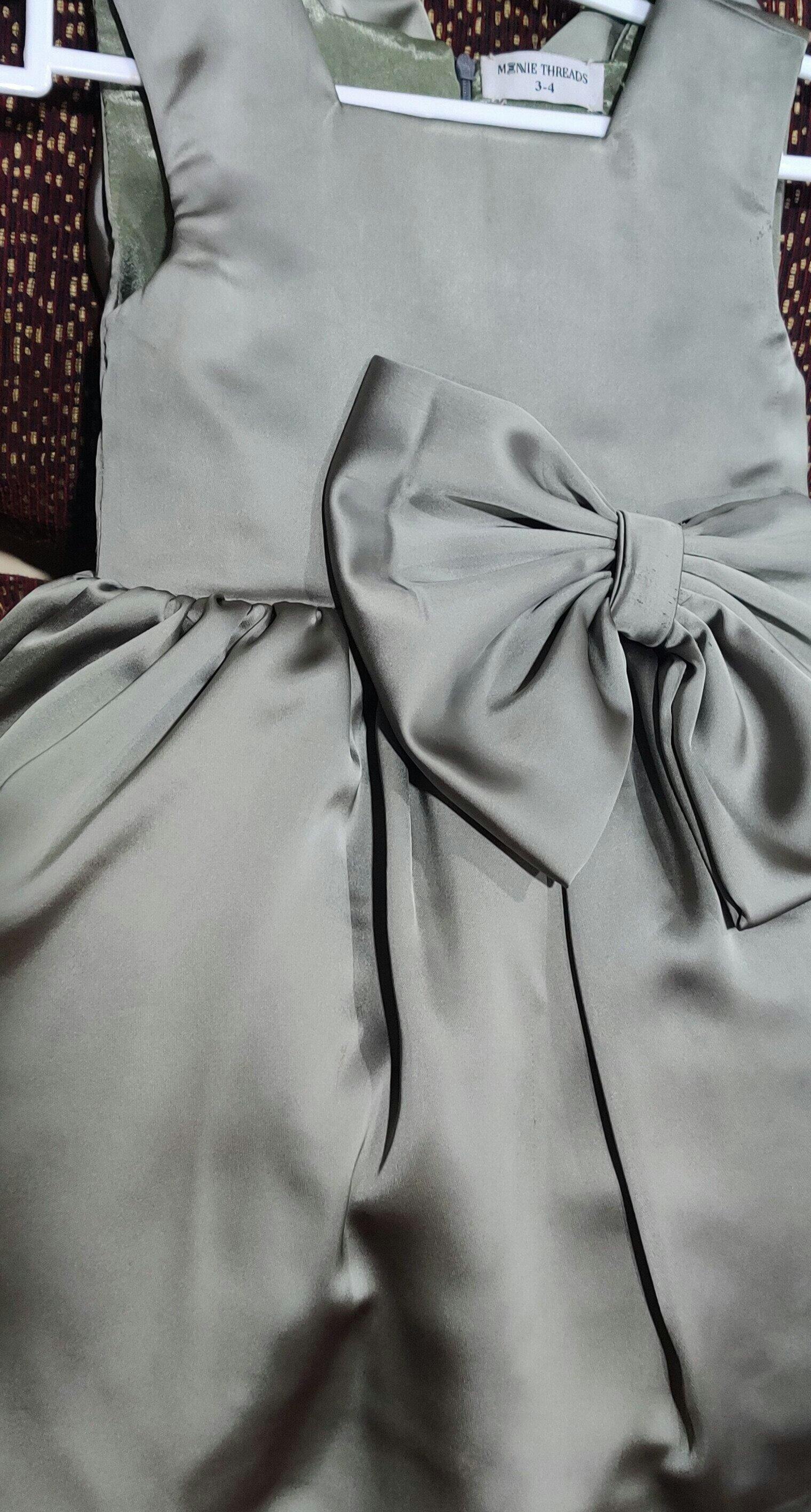 Description: A grey premium silk gown with puffed sleeves, front and back bows, and a gathered waist. Perfect for formal and semi-formal occasions.