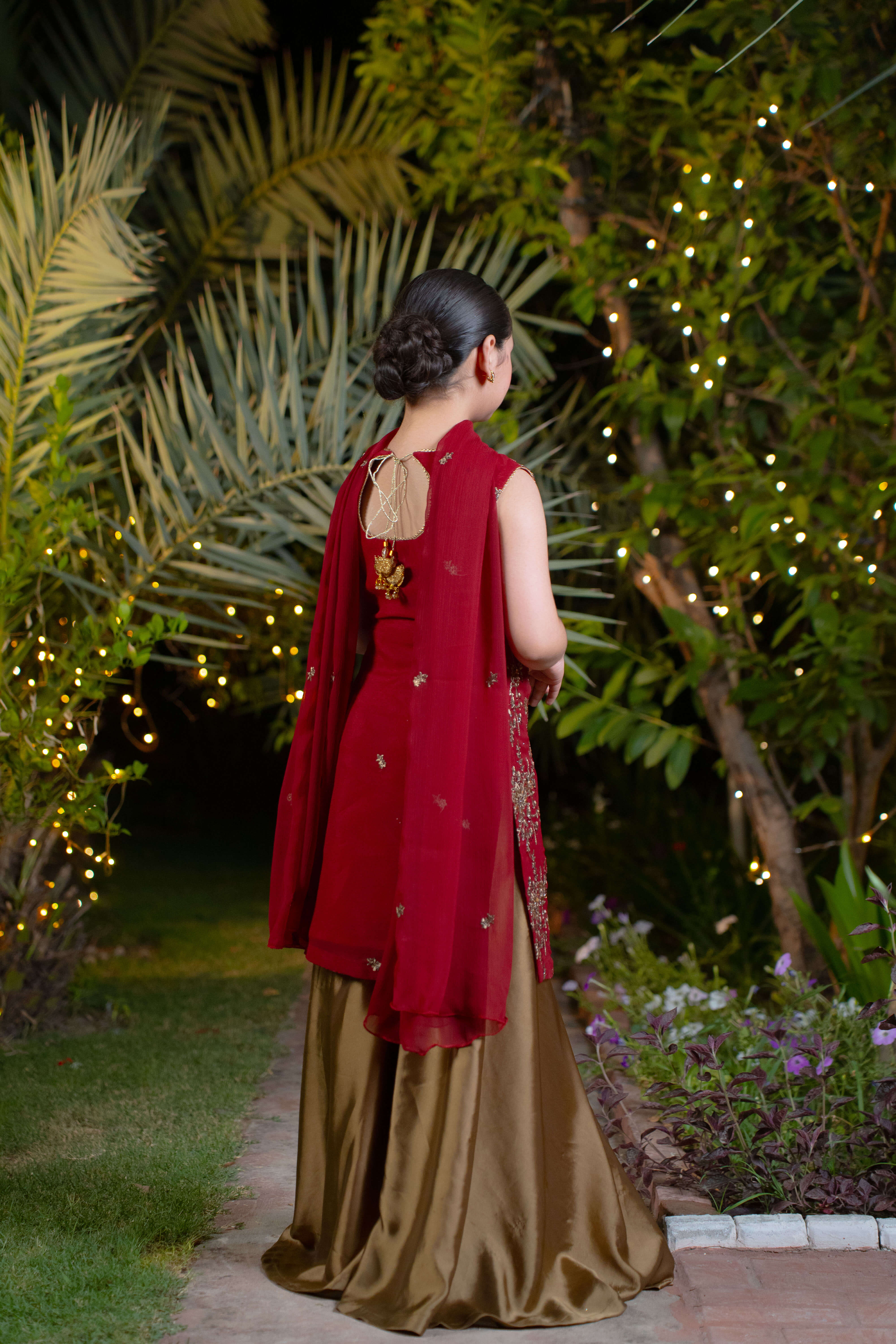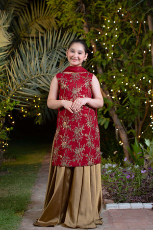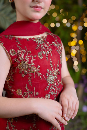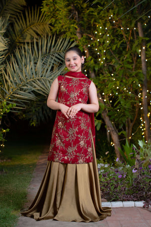 Zulekha is a truly regal creation featuring a maroon chiffon kurti intricately adorned with heavy champagne and gold cut daana work, creating a shimmering, embellished look. It is paired with a luxurious bronze gold silk sharara, adding richness and depth to the outfit. A matching maroon chiffon dupatta, finished with gold embroidery on the borders, completes this timeless and classic ensemble—perfect for grand festivities and wedding occasions.