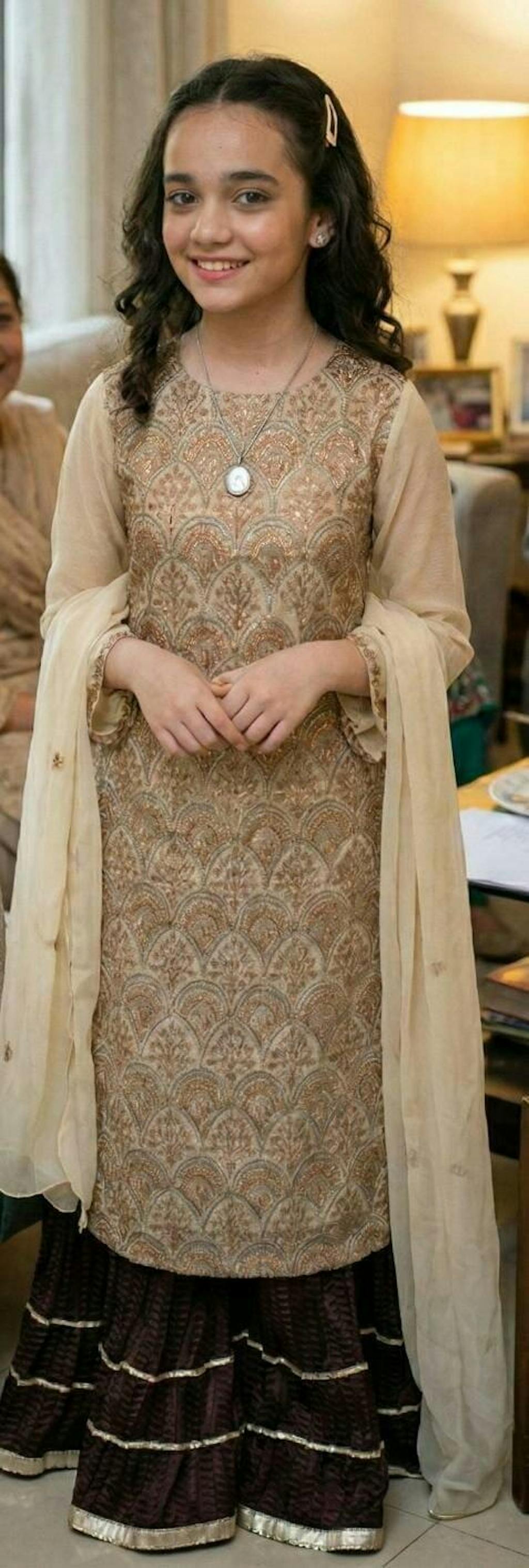 Zuleyha is a regal statement piece featuring a narrow long beige chiffon shirt adorned with heavy champagne cut daana embroidery. It is beautifully paired with a chocolate brown crushed sharara detailed with layered gold lace, creating a rich, textured look. A matching beige chiffon dupatta with delicate embroidery on the borders completes this elegant and luxurious festive ensemble.