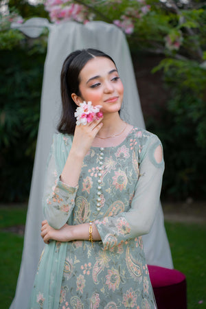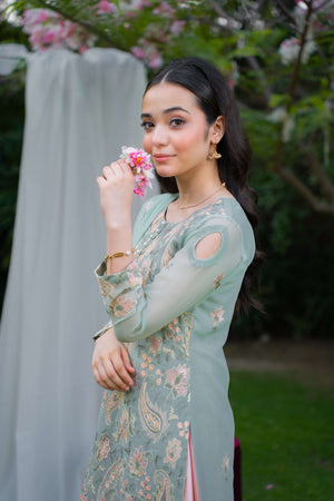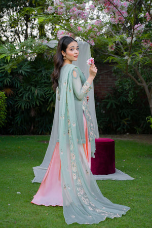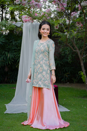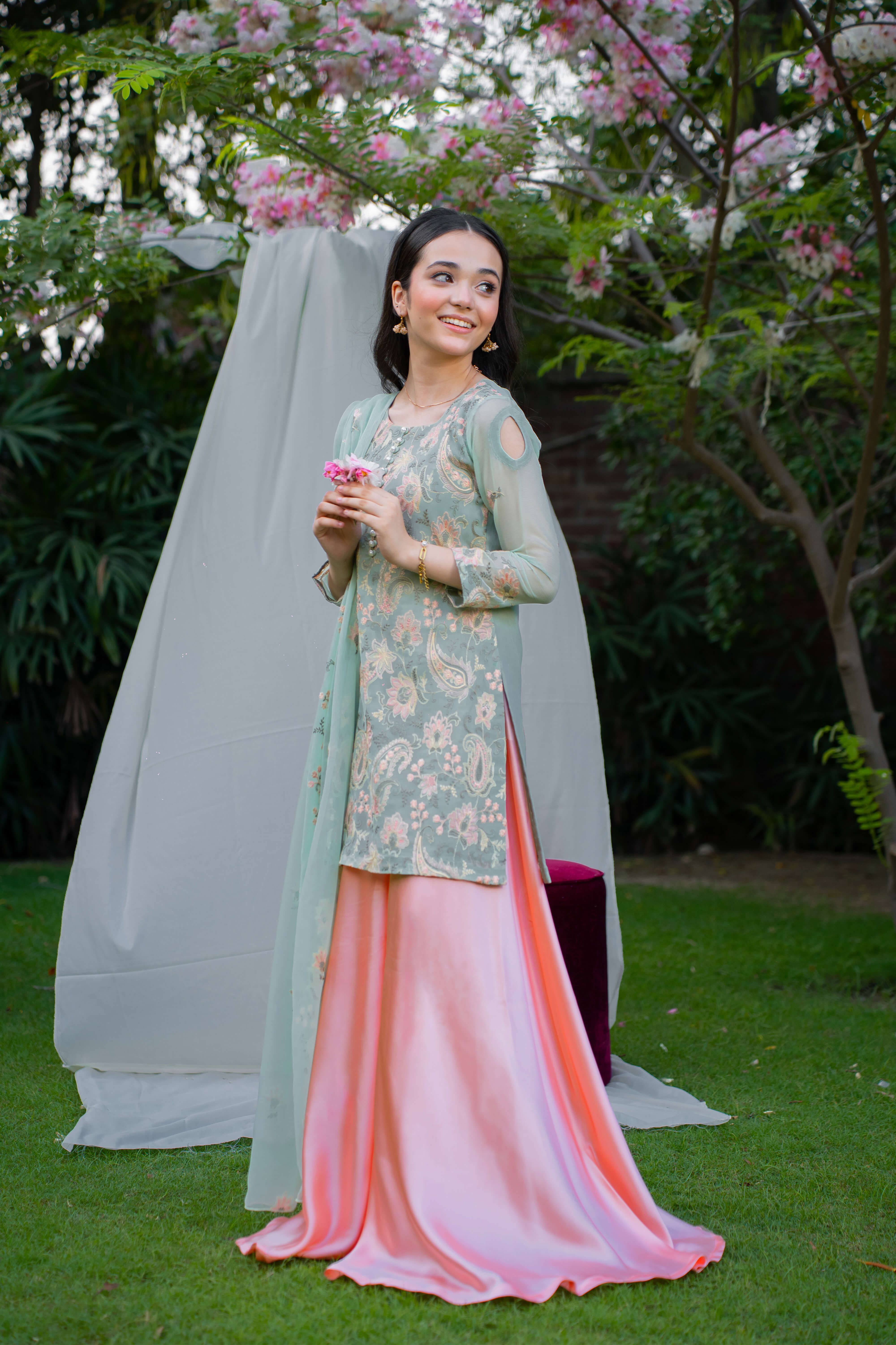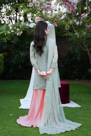 Zümrüt is a graceful blend of elegance and color harmony, featuring a sage green chiffon kurti adorned with delicate pink floral embroidery throughout, giving it a timeless and regal appeal. It is paired with a matching pink silk sharara boasting a grand flare, and a sage green chiffon dupatta highlighted with fine pink embroidery along the borders. An ideal pick for day events, weddings, or festive gatherings.