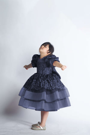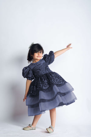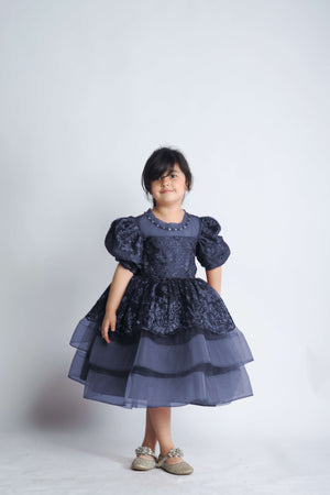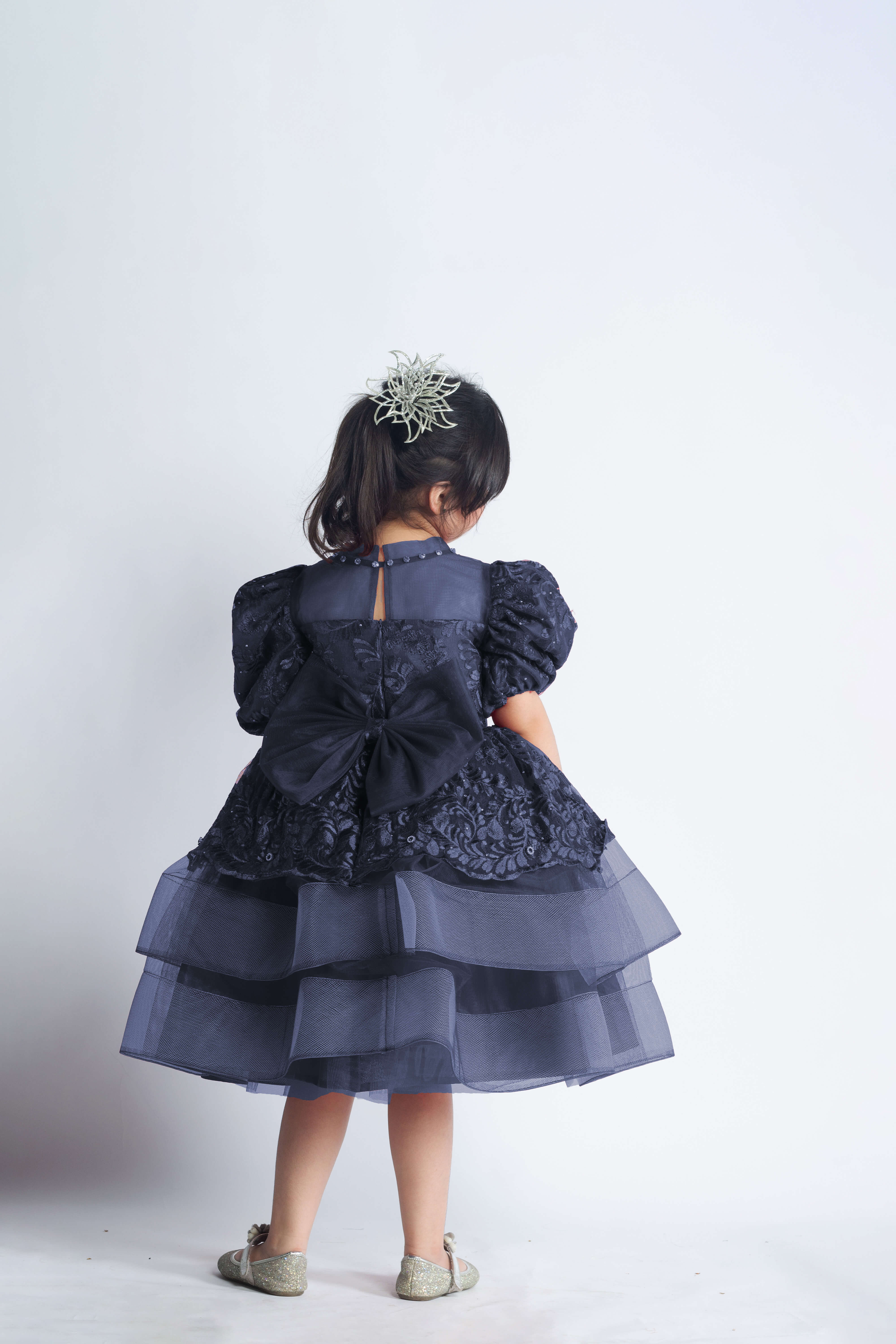 Description: A Navy Blue embroidered net frock with puff sleeves, layered tulle skirt, and soft silk lining—ideal for birthdays and special celebrations.
