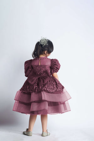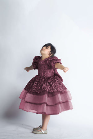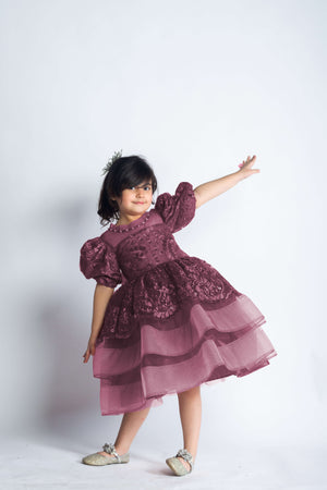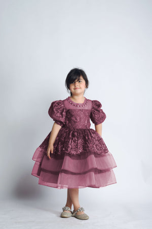 Description: A Pink embroidered net frock with puff sleeves, layered tulle skirt, and soft silk lining—ideal for birthdays and special celebrations.