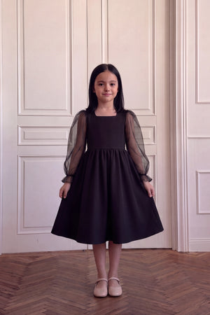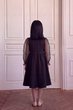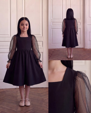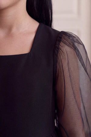 Description: A minimalist and chic black frock featuring a simple square neckline and sheer organza puff sleeves. The bodice and skirt provide a clean, tailored silhouette with no additional embellishments.