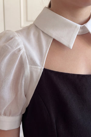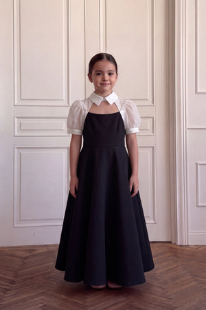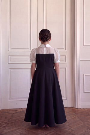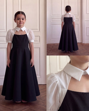 Description: A sophisticated black gown featuring a contrasting white collared bodice and puff sleeves, blending vintage-inspired charm with modern elegance. The structured A-line, floor-length skirt provides a graceful silhouette, making this the perfect choice for formal gatherings and special occasions.