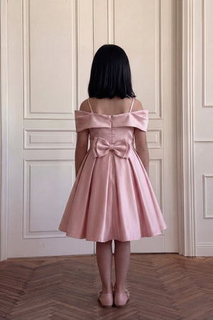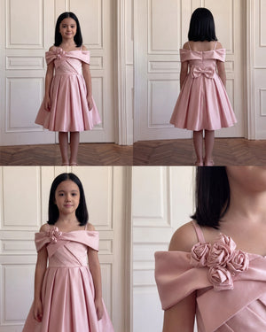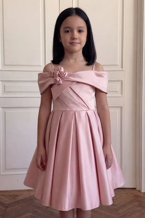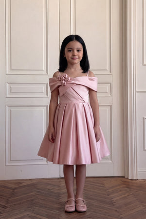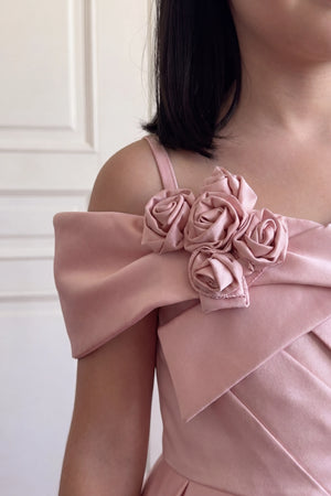 Description: A stunning blush pink frock featuring an elegant off-shoulder neckline with sophisticated fabric draping. The bodice is accented with a delicate cluster of handmade rosettes on the shoulder, flowing into a voluminous, structured skirt that creates a graceful and timeless silhouette.