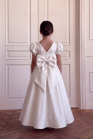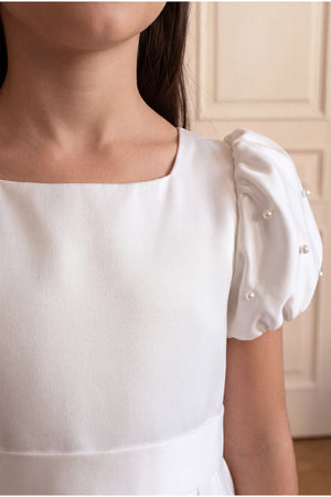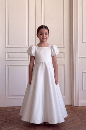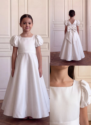 Description: A classic off-white silk gown with a square neck and pearl-embellished puff sleeves. It features a fitted waist belt and a full, flared skirt that gives a clean and royal look.