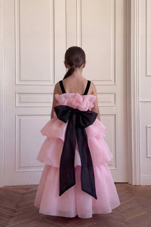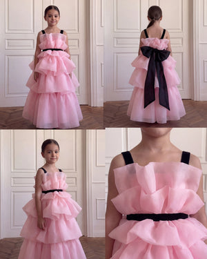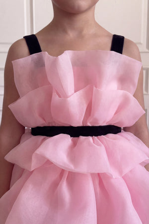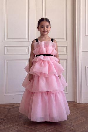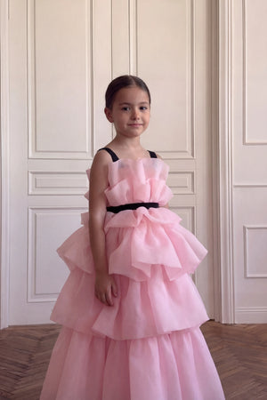 Description: A whimsical soft pink gown featuring tiered, airy ruffles for a voluminous and dreamy look. It is finished with elegant black straps and a matching black waist belt that provides a sophisticated contrast to the flowing skirt.