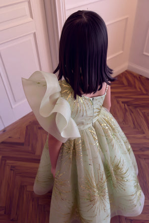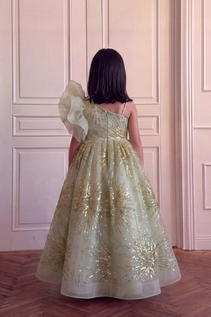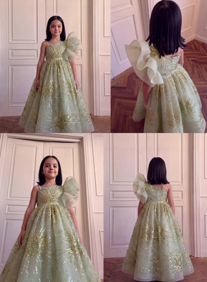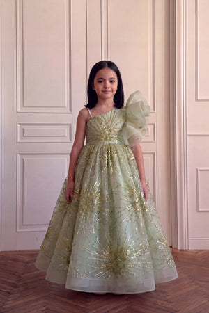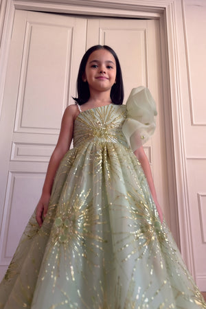 Description: A mint green gown with a sleeveless fitted bodice and a round neckline decorated with pearl detailing. The dress features a large organza bow on one shoulder and a flared layered skirt with glittery starburst patterns that add shine and volume.