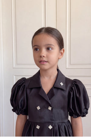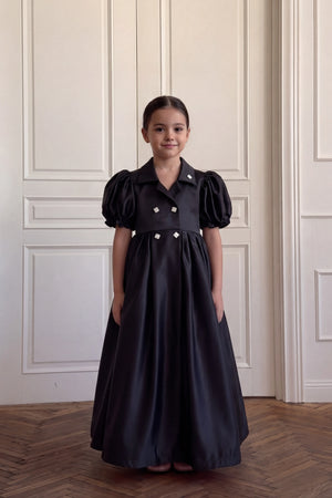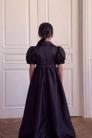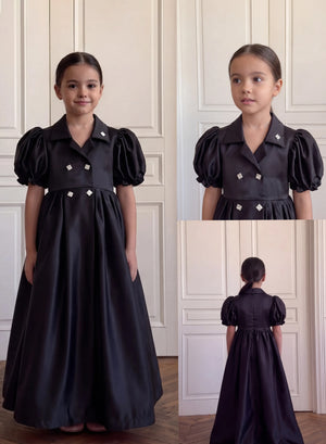 Description: A black gown with a collar neckline and puff sleeves. It has buttons on the front and a gathered waist that gives the skirt a nice flared shape. The design looks neat and stylish for formal wear.