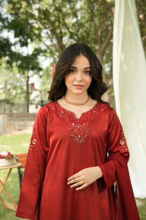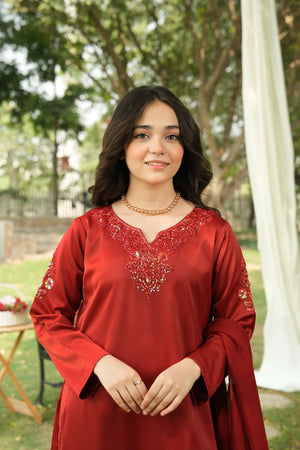 A captivating maroon ensemble that radiates royal elegance. The intricate red-on-red adda work and crystal detailing make it ideal for festive occasions, weddings, and evening events.