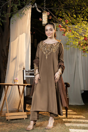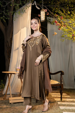 Dupatta: Pure chiffon smoky brown dupatta.