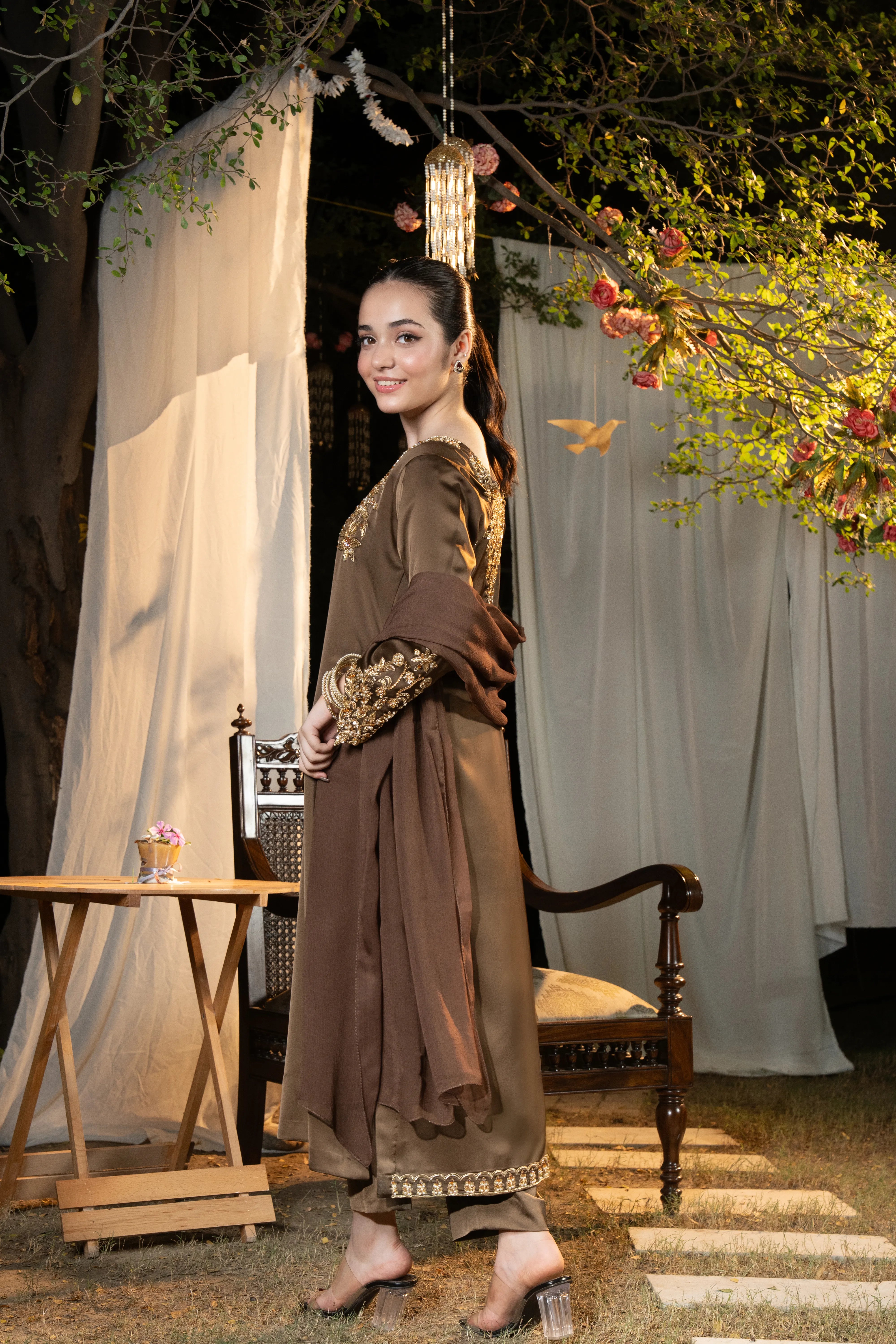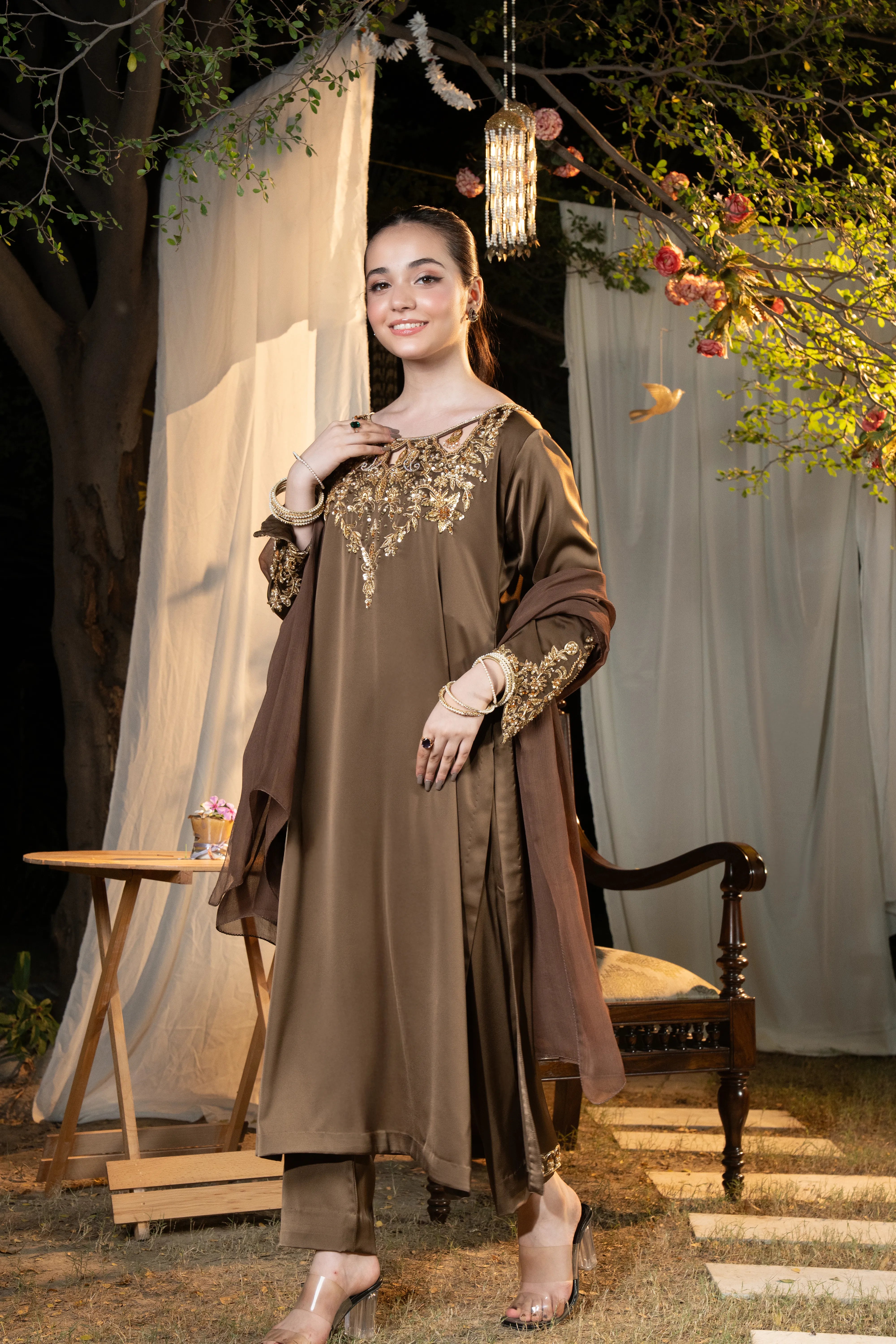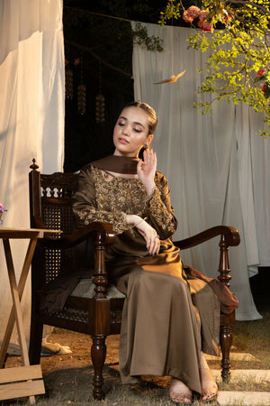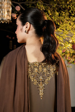 An epitome of elegance — Hazel captures the essence of royal craftsmanship with its opulent gold adda work and graceful smoky brown hue, making it an unforgettable choice for grand occasions.