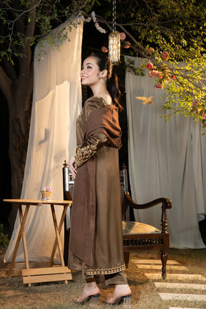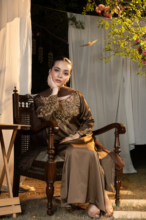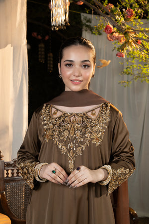 Shirt: A breathtaking smoky brown Korean silk long shirt featuring an intricately scalloped neckline embellished with heavy gold adda work. The front neckline radiates opulence with dense dabka detailing, while the back neckline and daaman are richly adorned with handcrafted flowery adda bails. The pointed sleeves elevate the grandeur, embellished along all edges with dabka, naqshi, and stone work in antique gold tones—a perfect blend of traditional artistry and regal sophistication.
