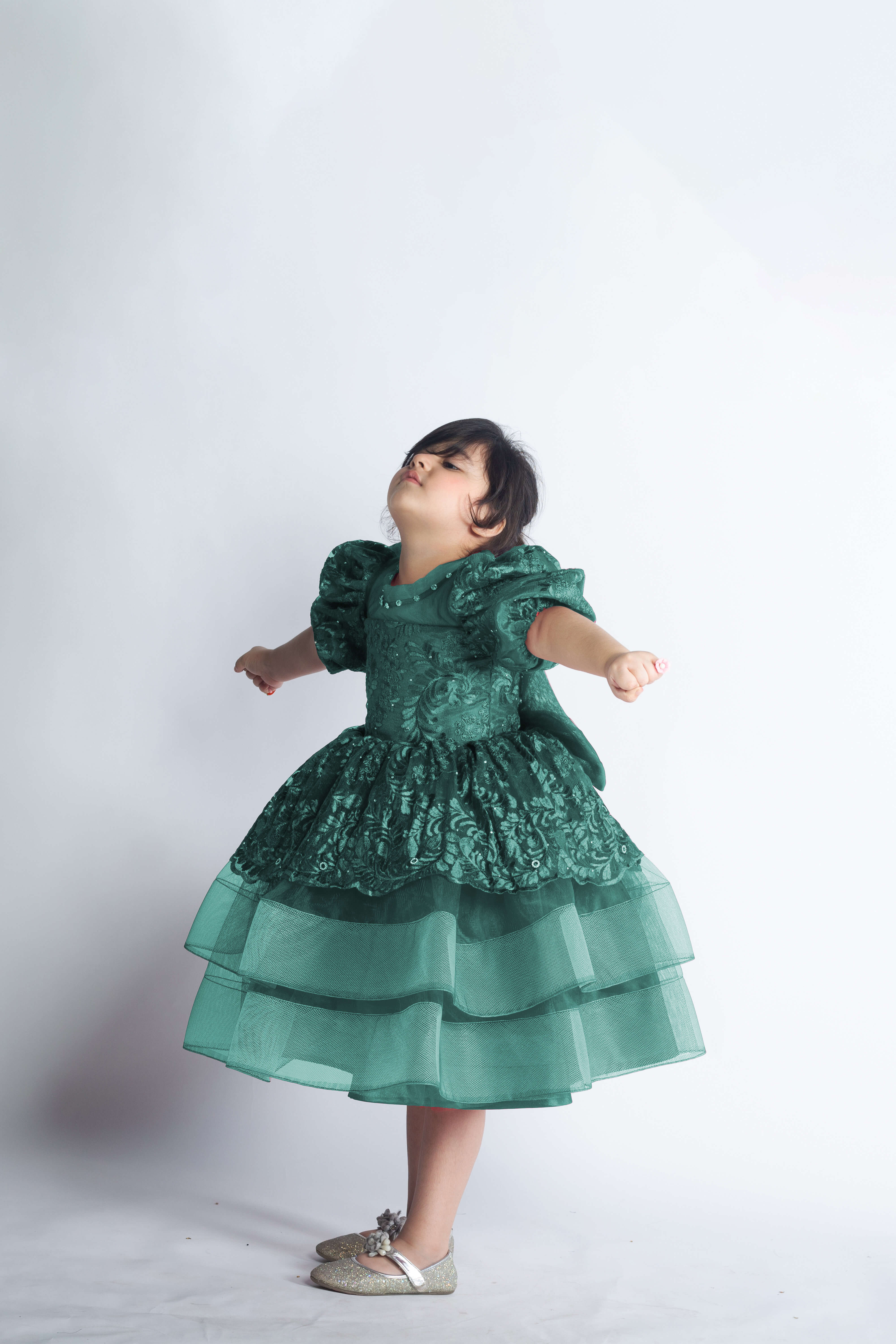 Description: A Sea Green embroidered net frock with puff sleeves, layered tulle skirt, and soft silk lining—ideal for birthdays and special celebrations.