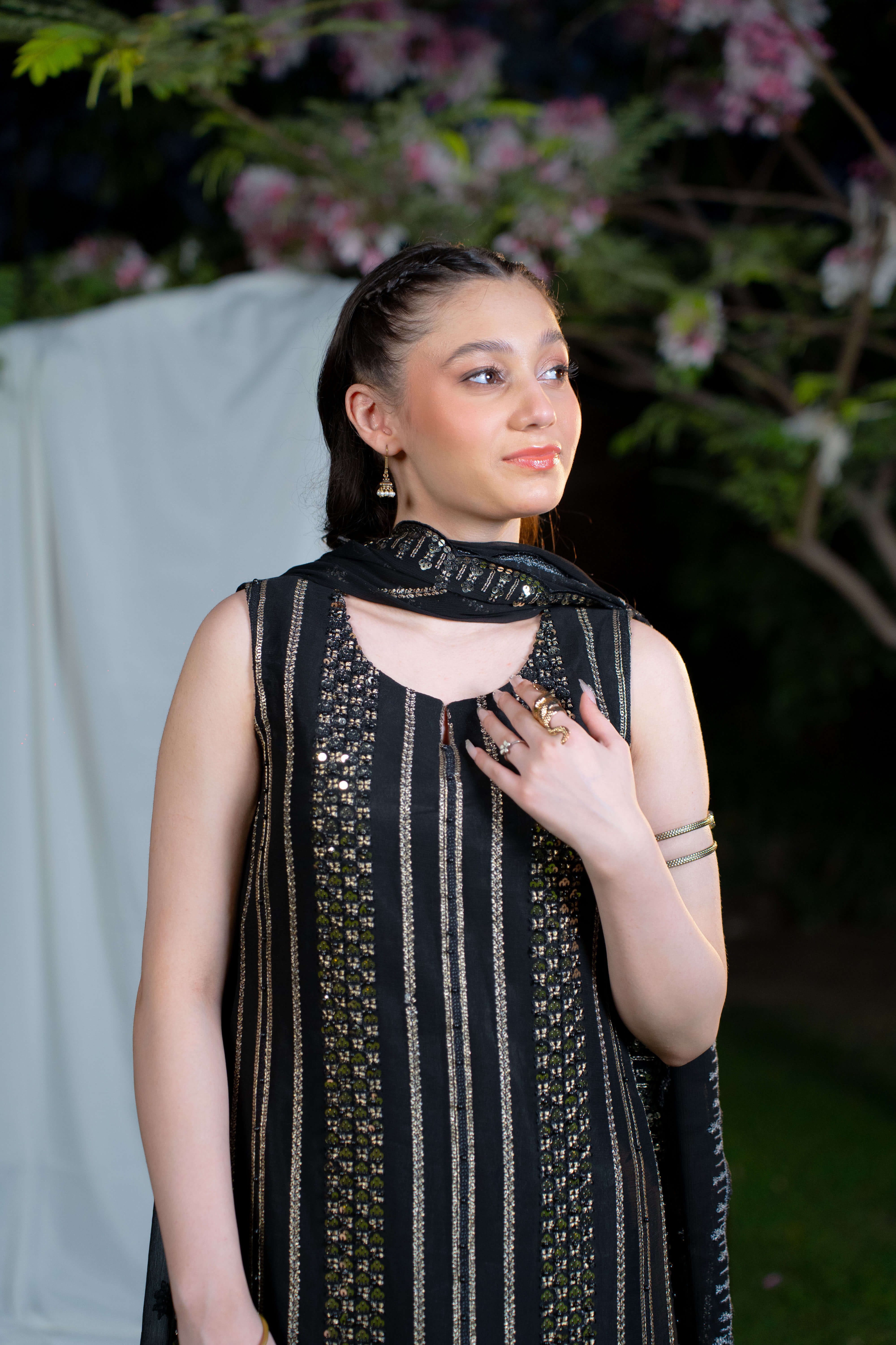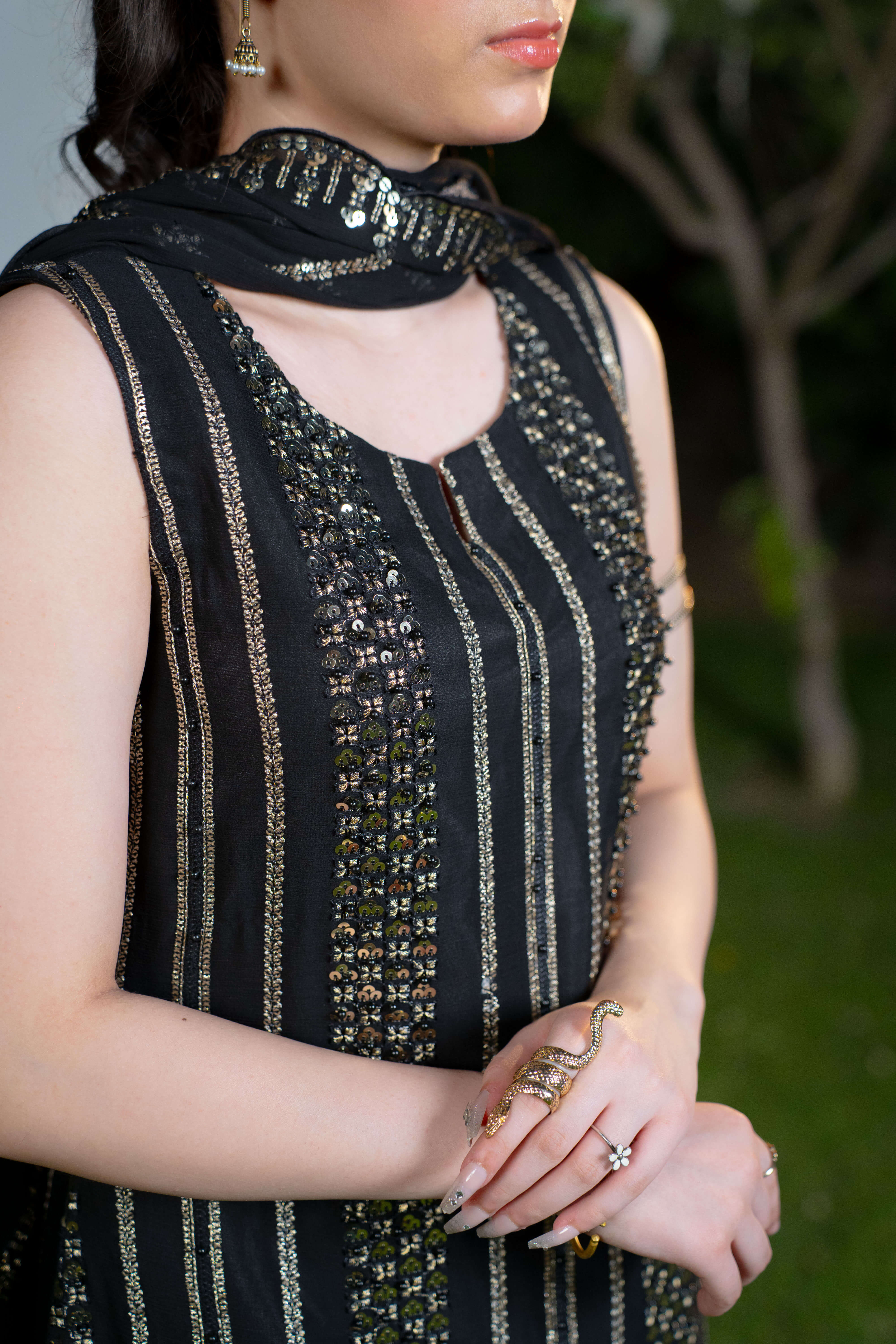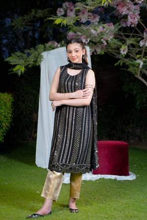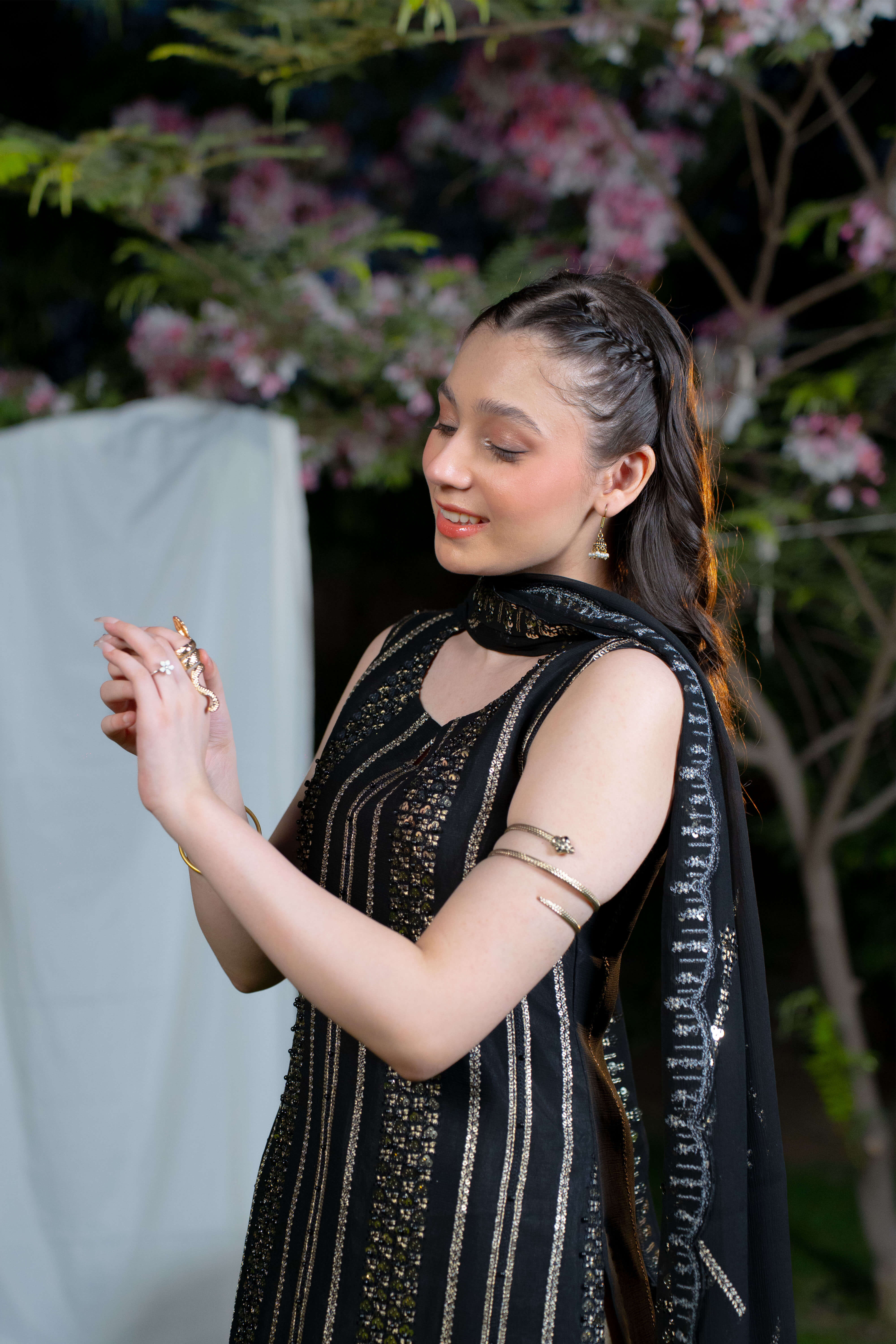 Asel is a striking ensemble featuring a black chiffon long shirt adorned with gold sequin embroidery in vertical panels, finished with scalloped detailing and heavy sequin embellishments on the daaman. It is paired with a rich gold jamawar trouser that adds a royal texture and depth to the look. A black chiffon dupatta with gold embroidery on the borders completes this statement outfit—perfect for formal gatherings and evening celebrations.