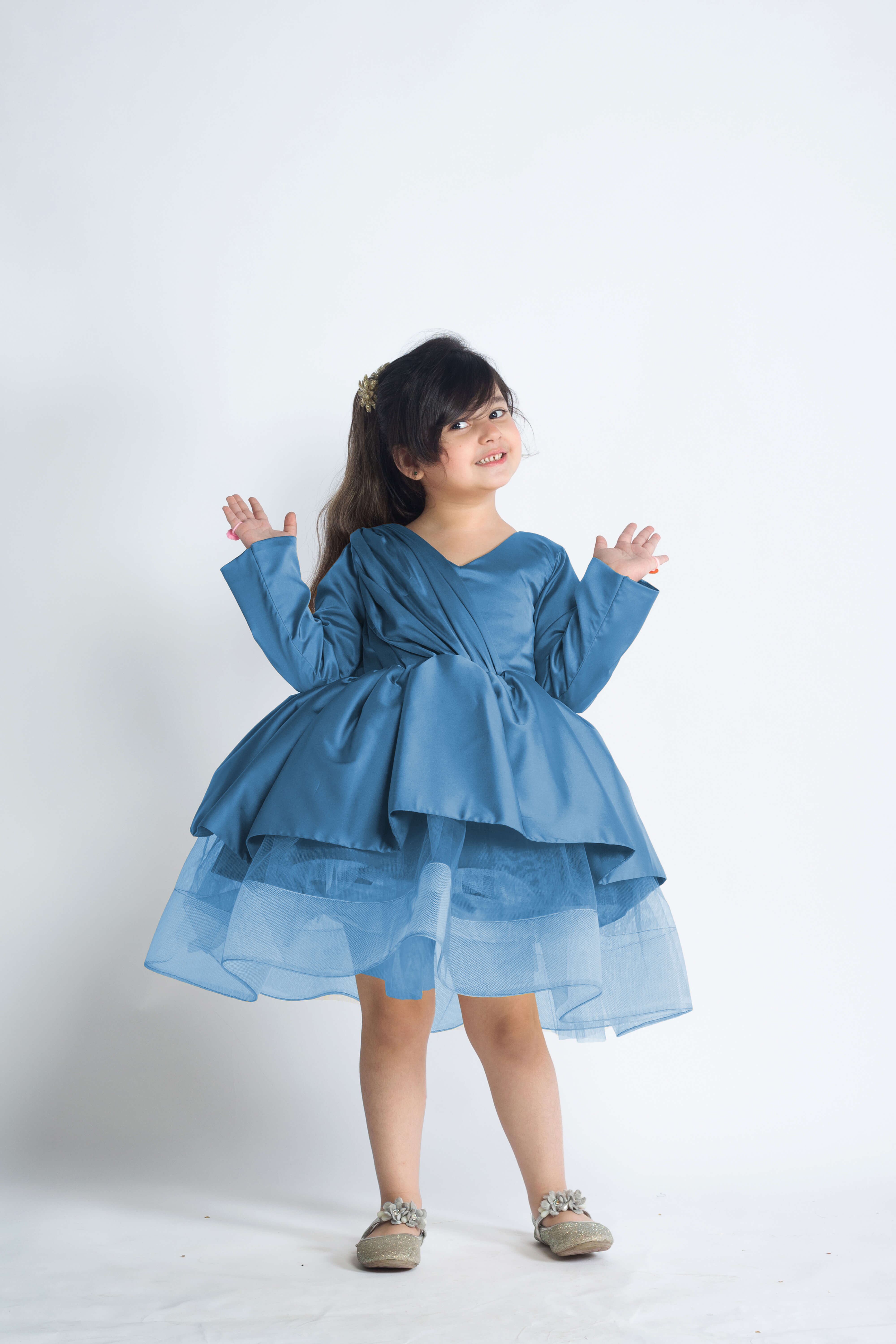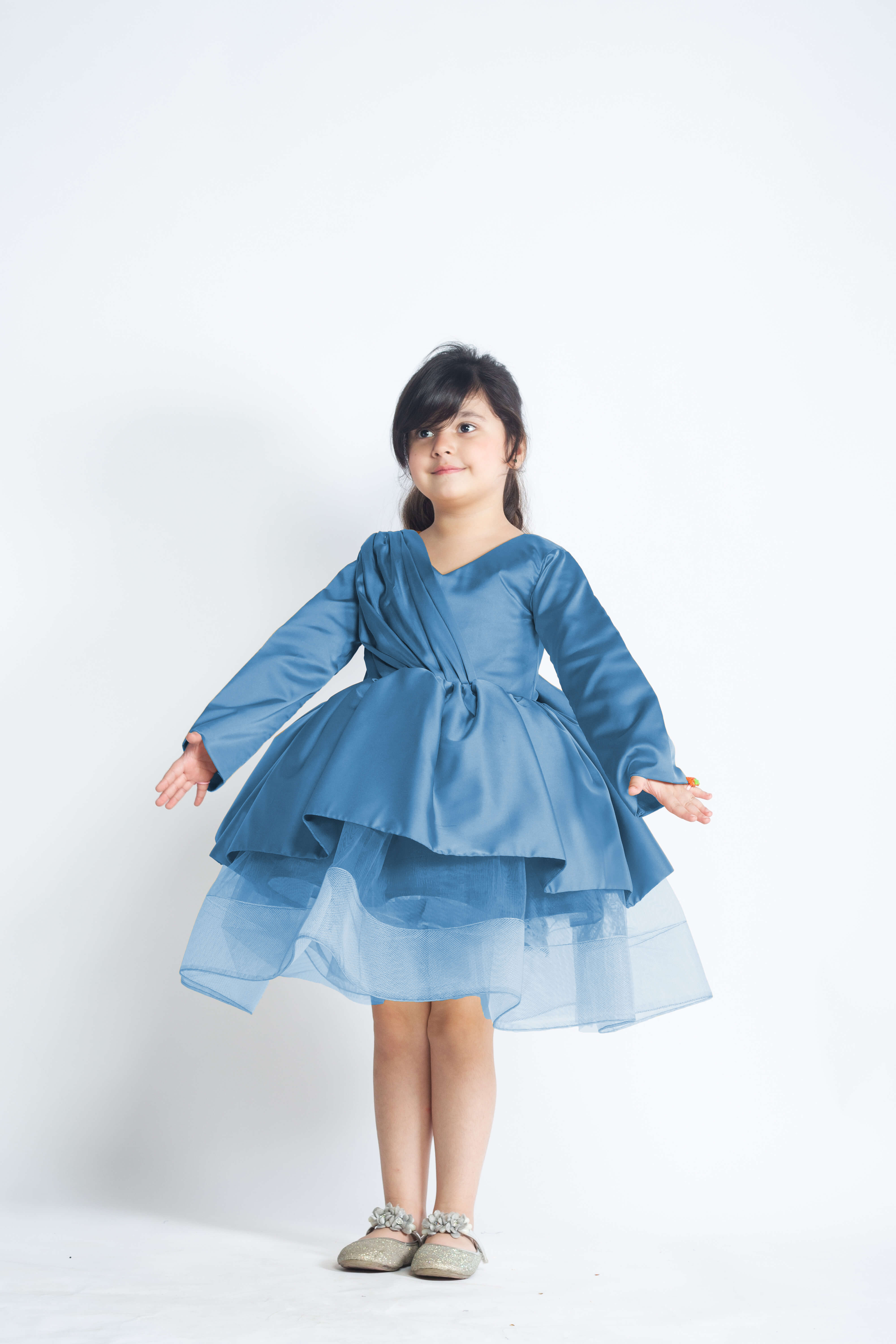 Description: A Sea Green frock featuring a wrap-style silk bodice and voluminous layered net skirt with soft silk lining. Perfect for weddings and festive occasions.