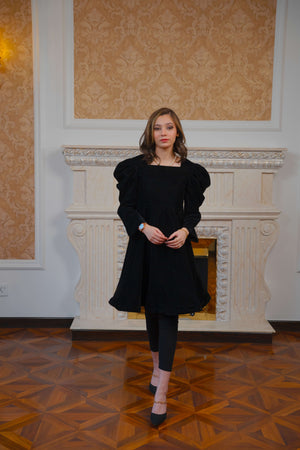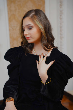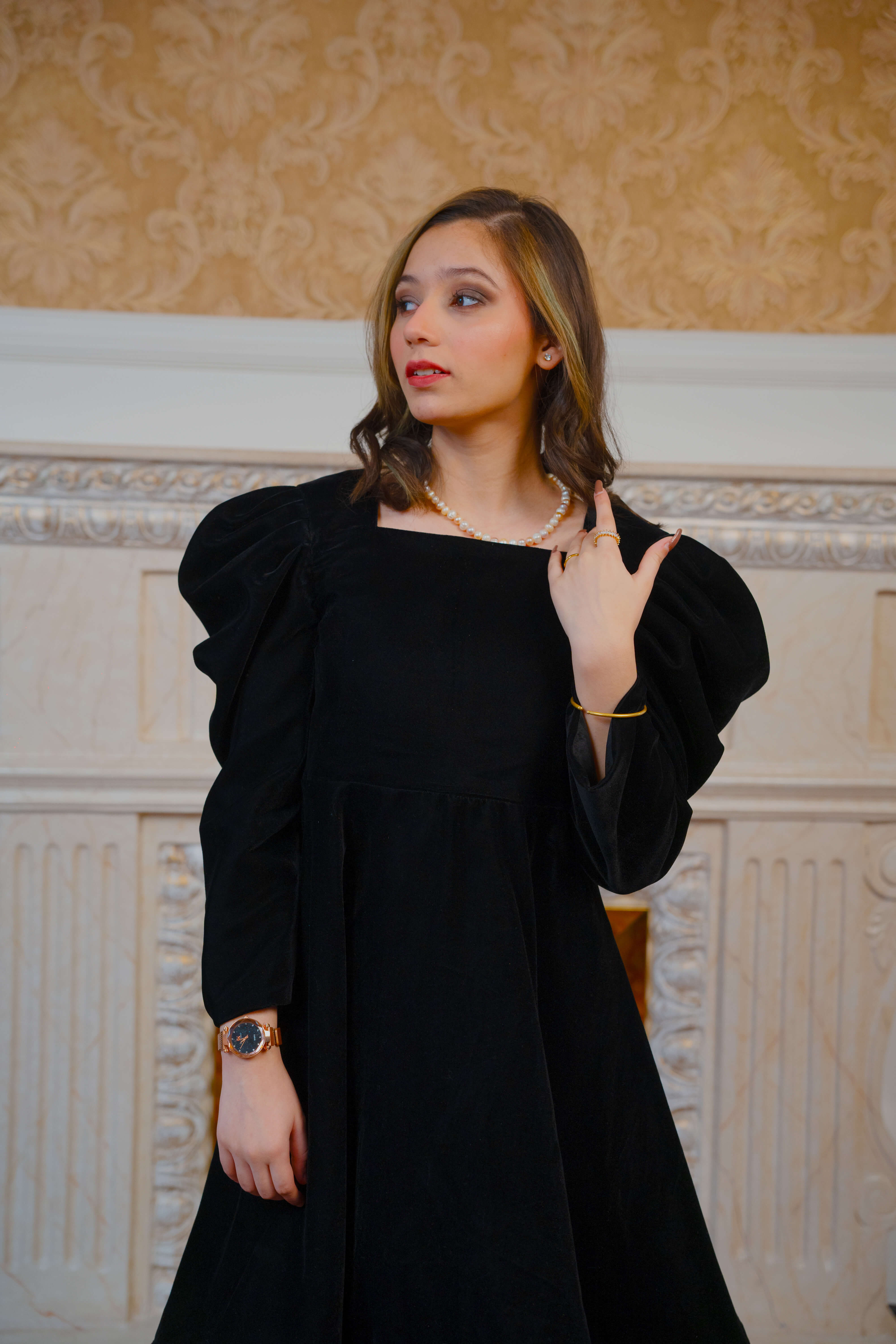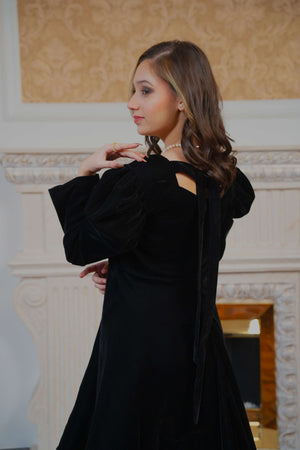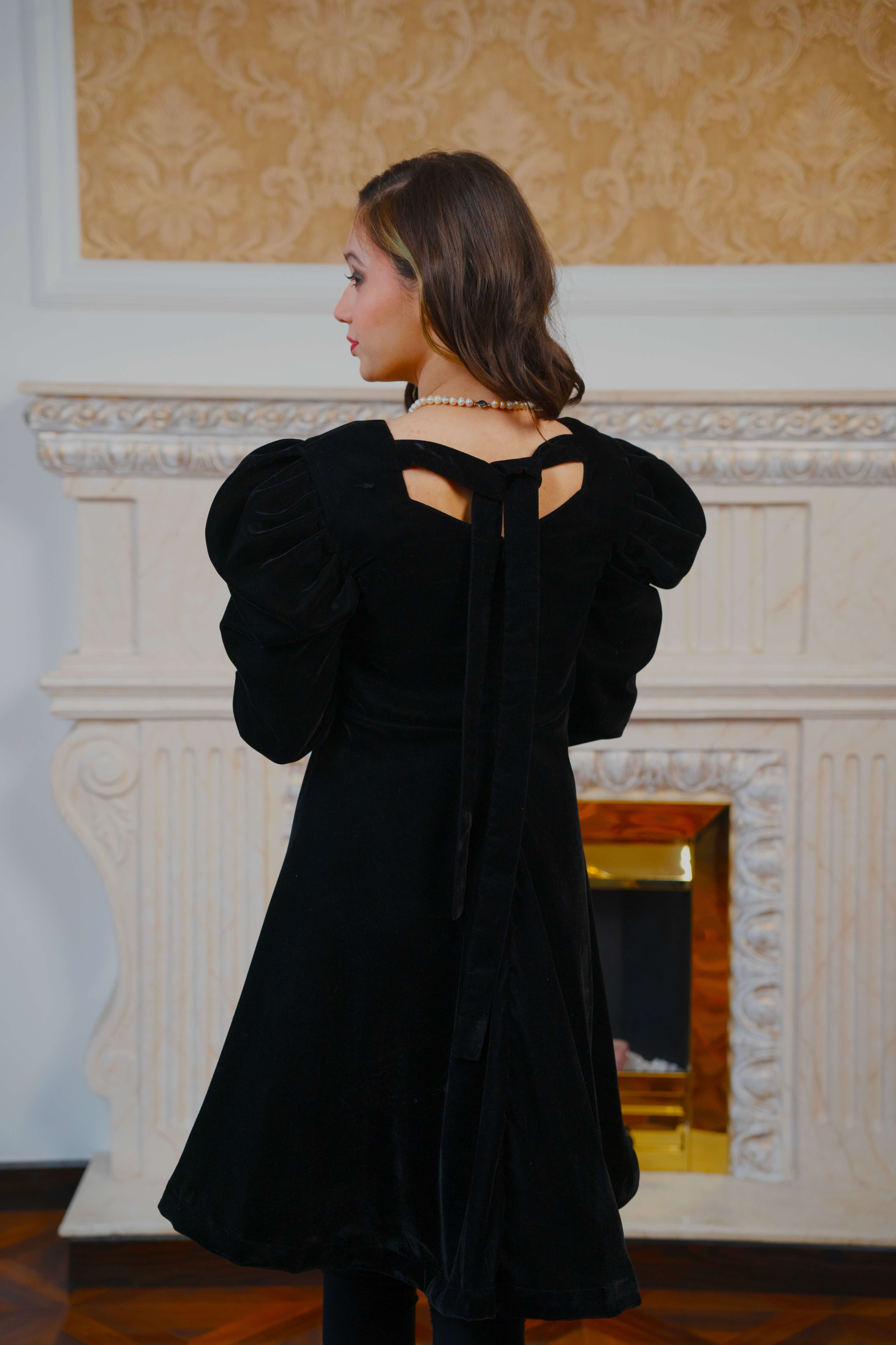 Description: A chic black velvet top with dramatic puffy sleeves and a sleek straight fit. Features a stylish open-back design with velvet strings for an adjustable knot. Perfect for formal evenings, parties, and special occasions.
