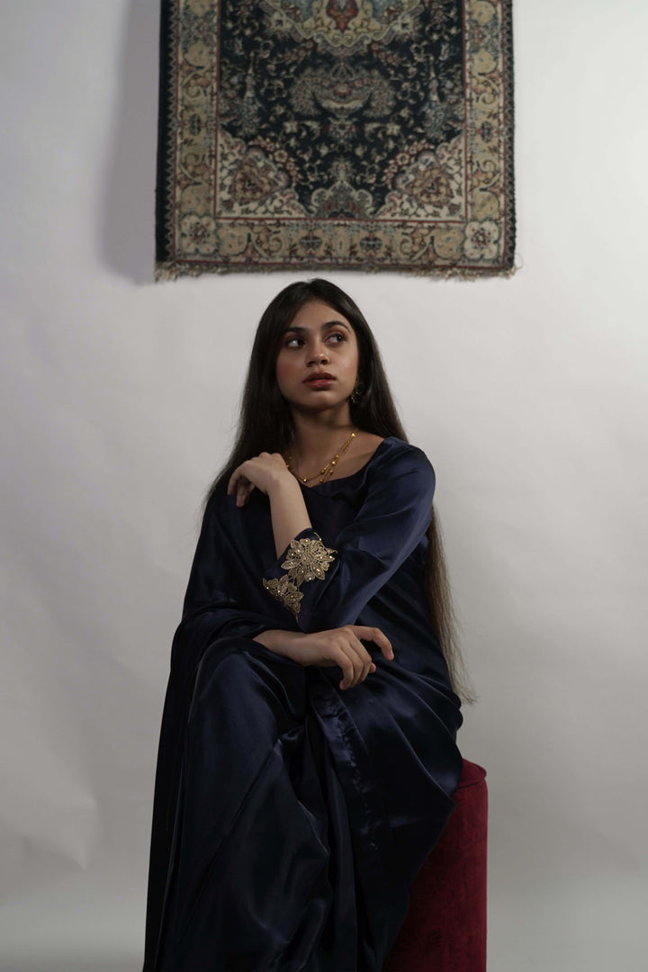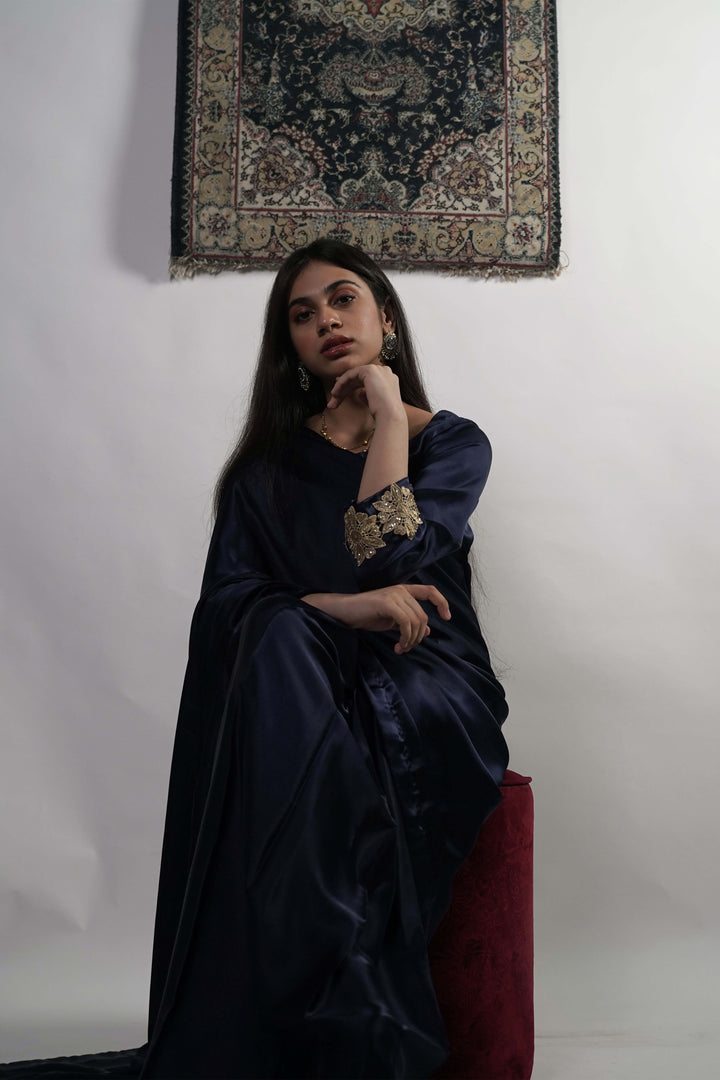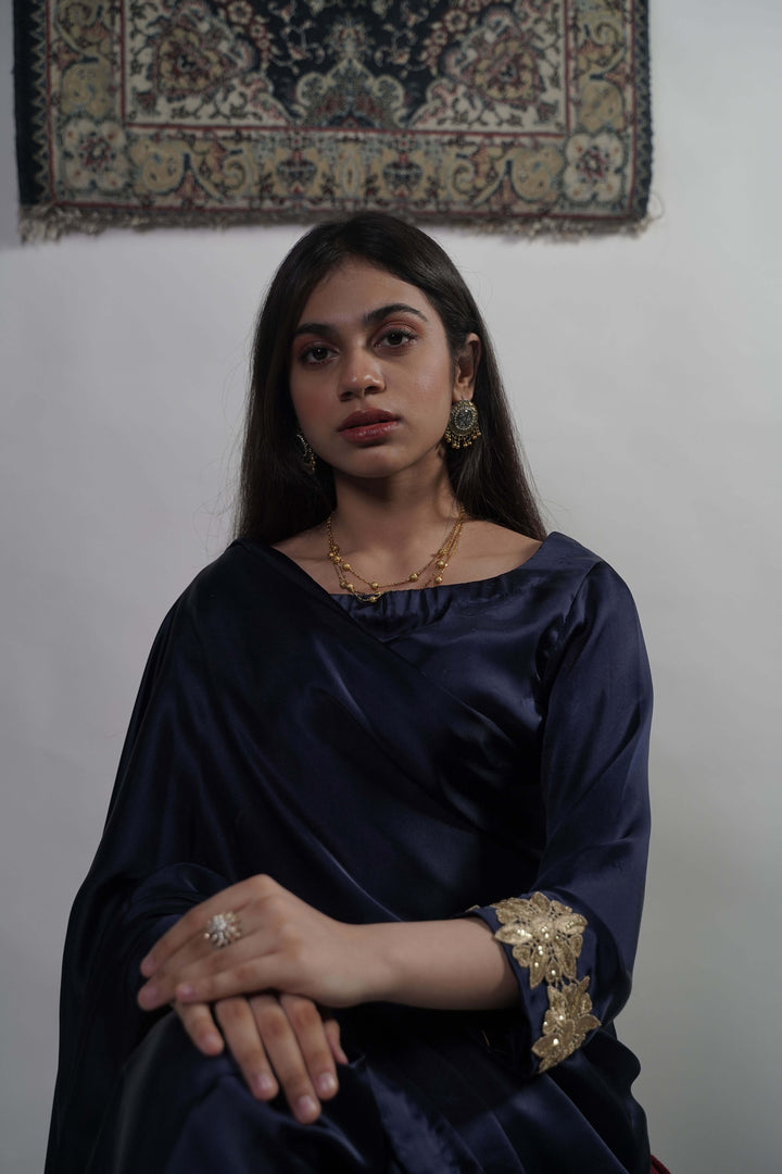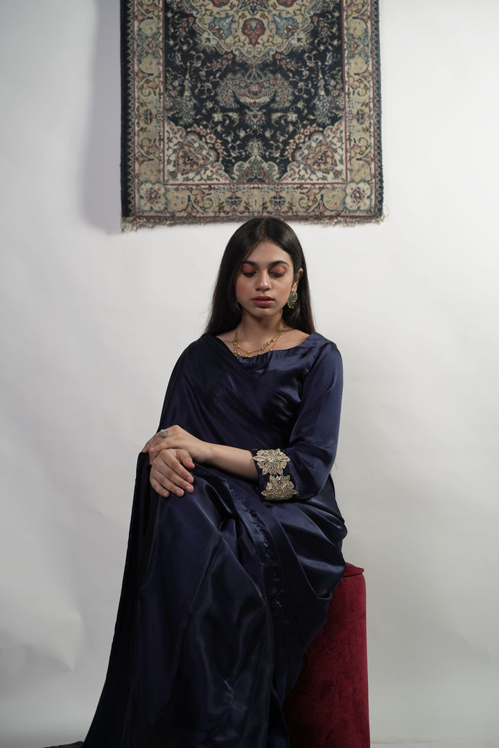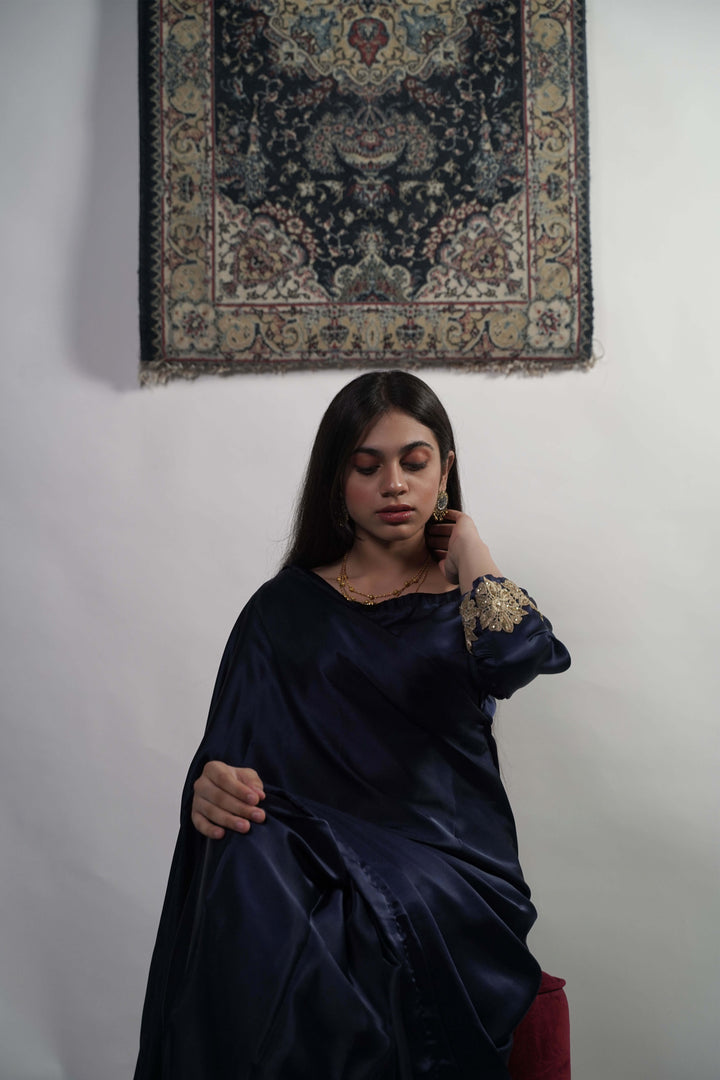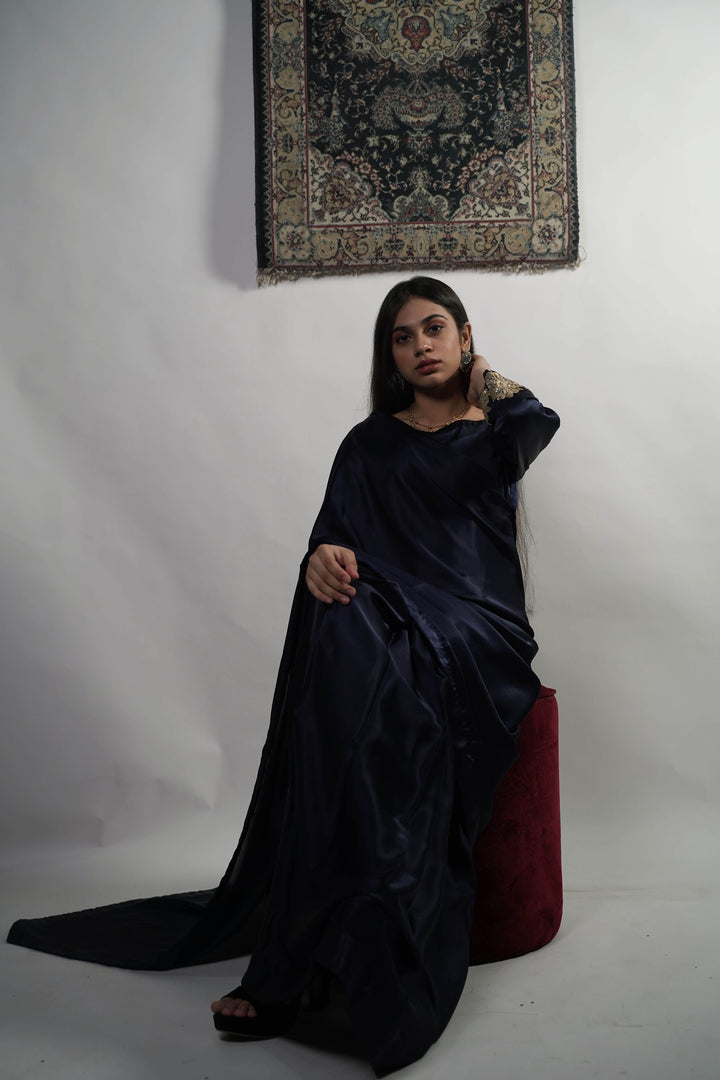 Description: A deep navy blue shamoz silk saree paired with a shamoz silk blouse featuring delicate gold flowery lace on the sleeves, adding charm and sophistication. Perfect for those who appreciate timeless elegance and understated style.