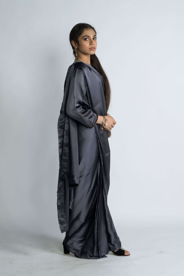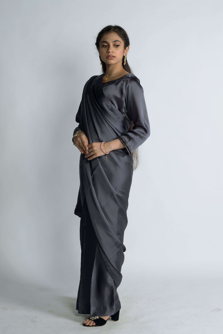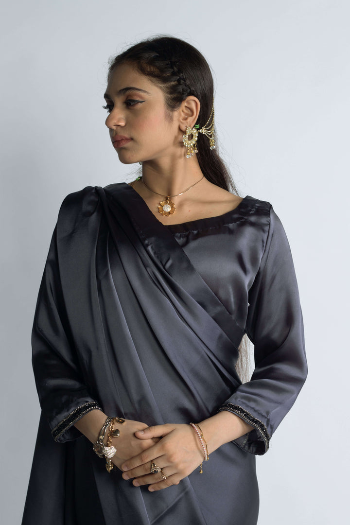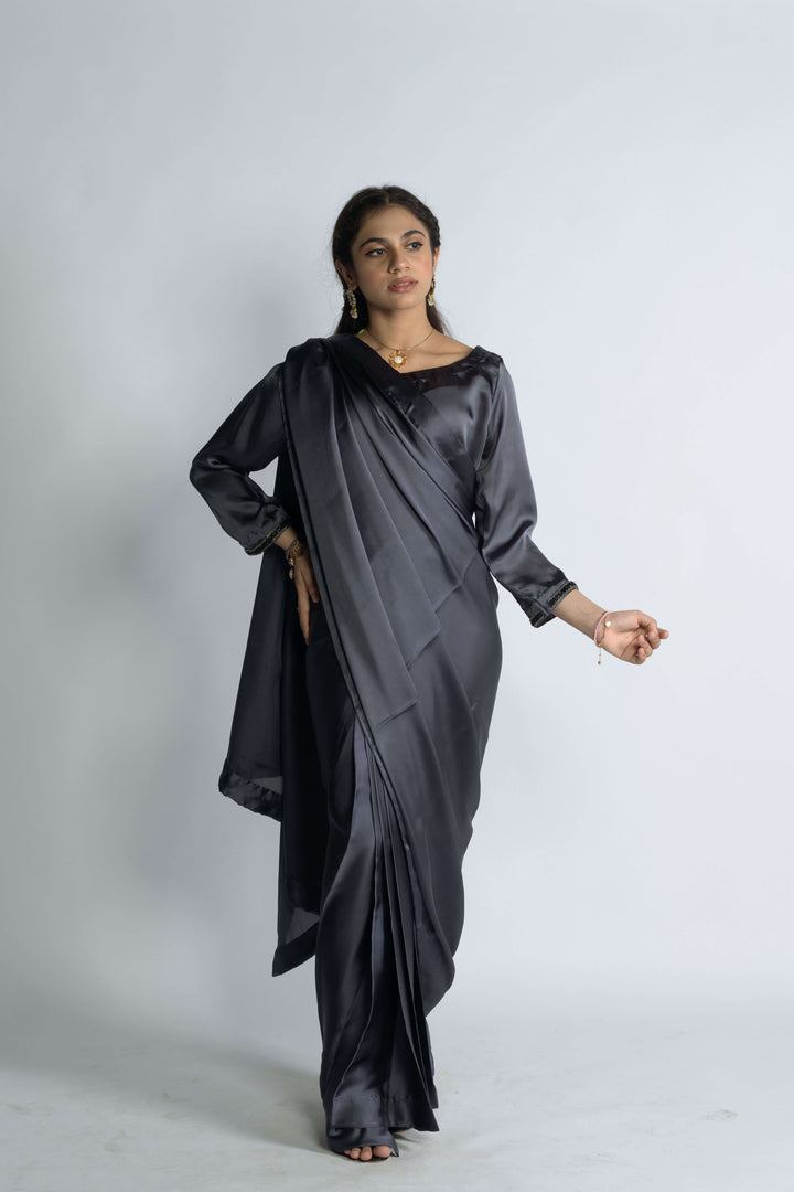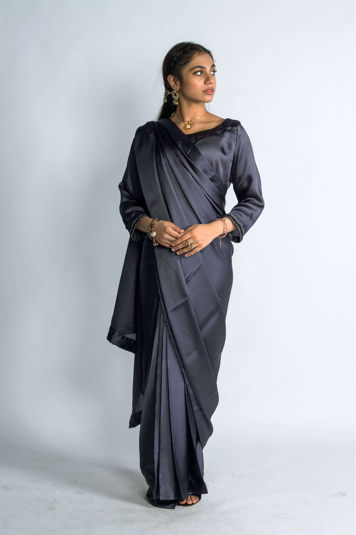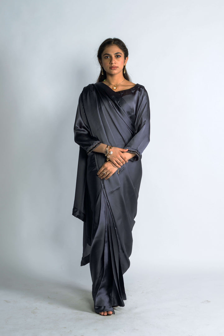 Description: A charcoal shamoz silk saree paired with a blouse featuring black kundan lace sleeves. A timeless and elegant look for formal events.