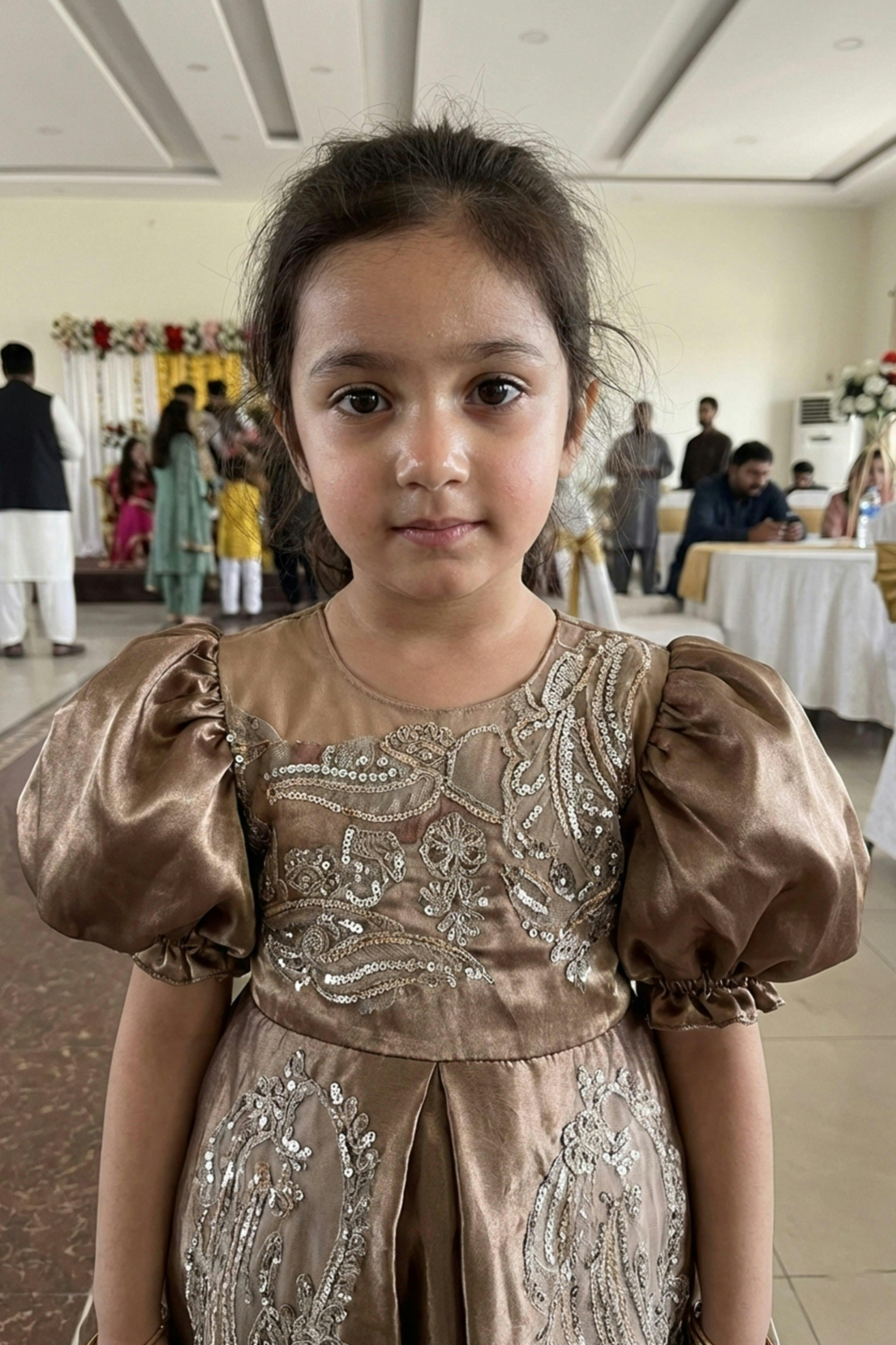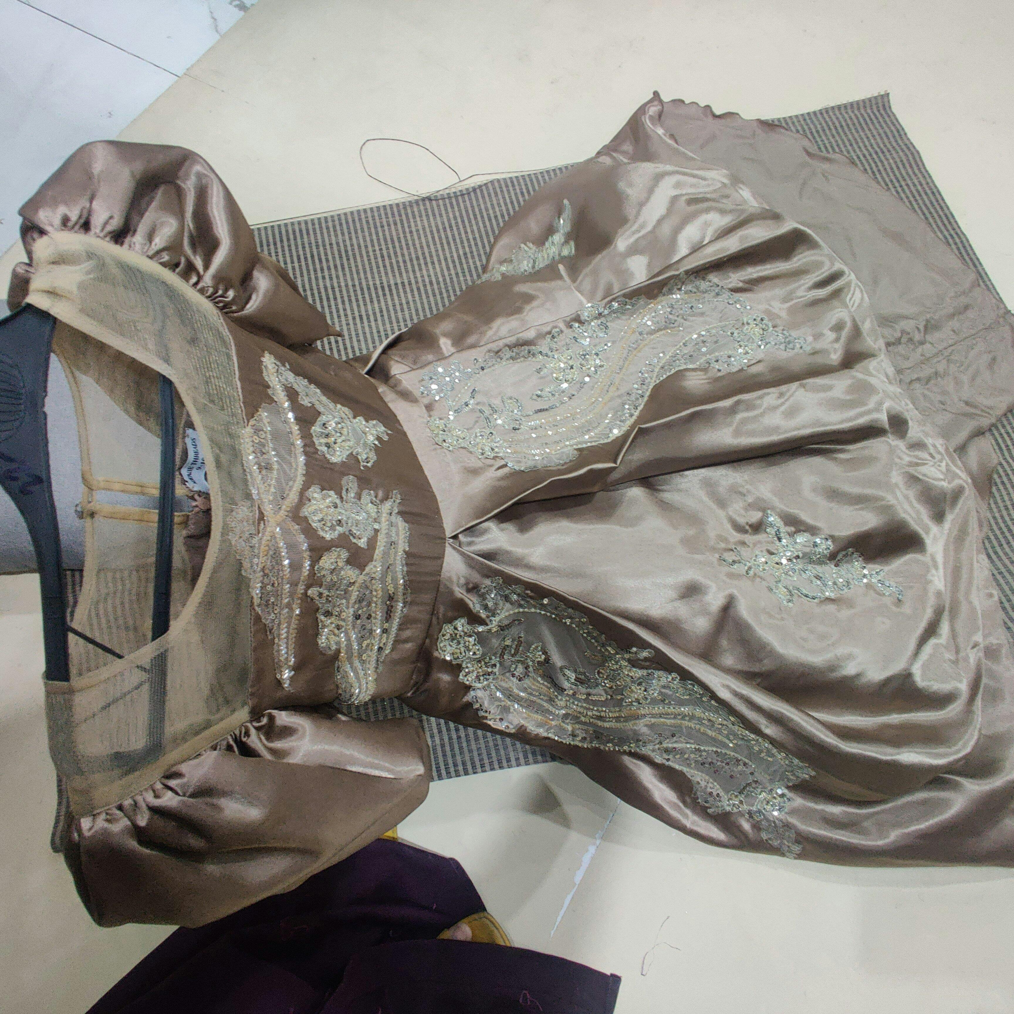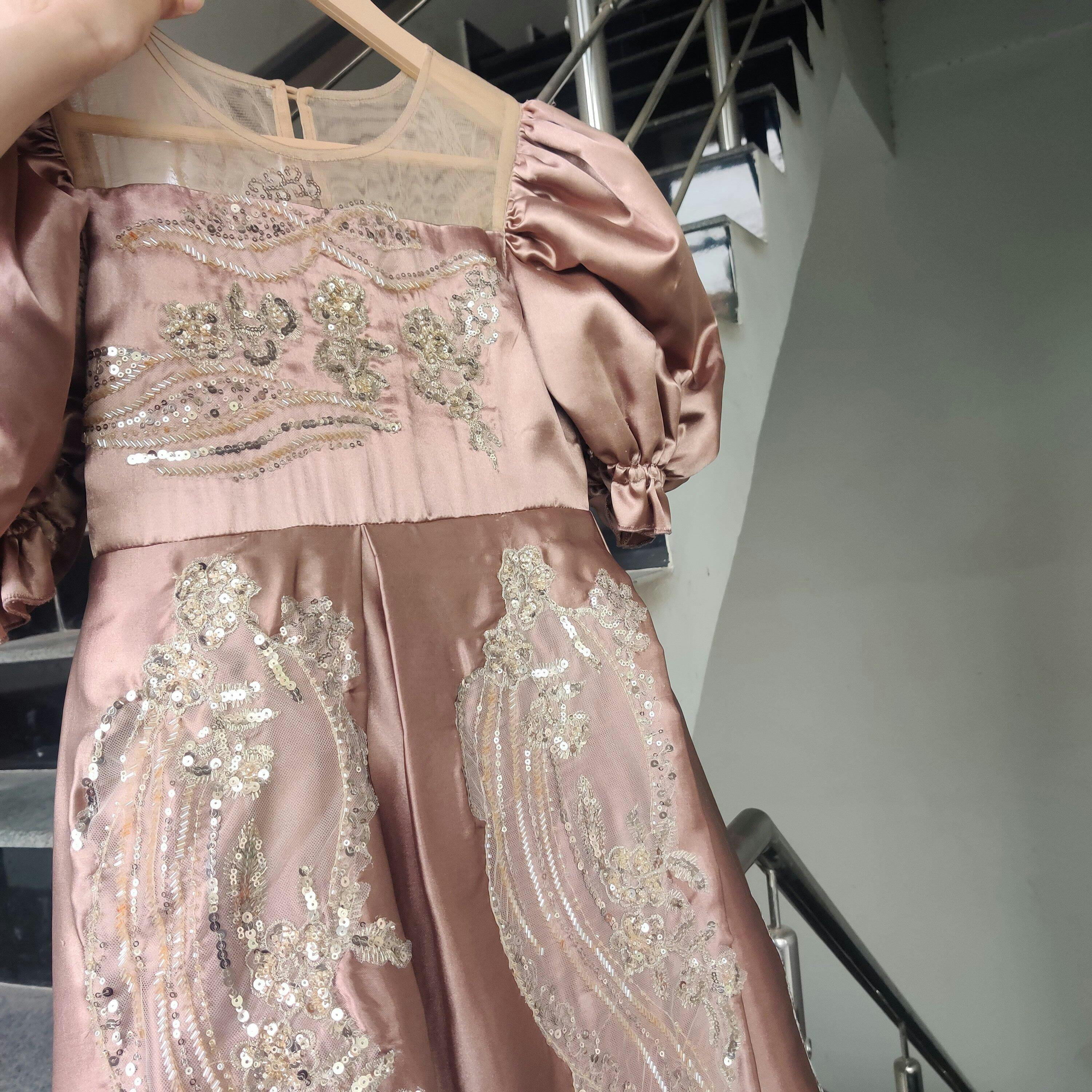 Description: A luxurious rose gold premium silk frock with puffy sleeves, a graceful back tail, and handcrafted cut daana work on the front and back. Ideal for weddings, parties, and special events.
