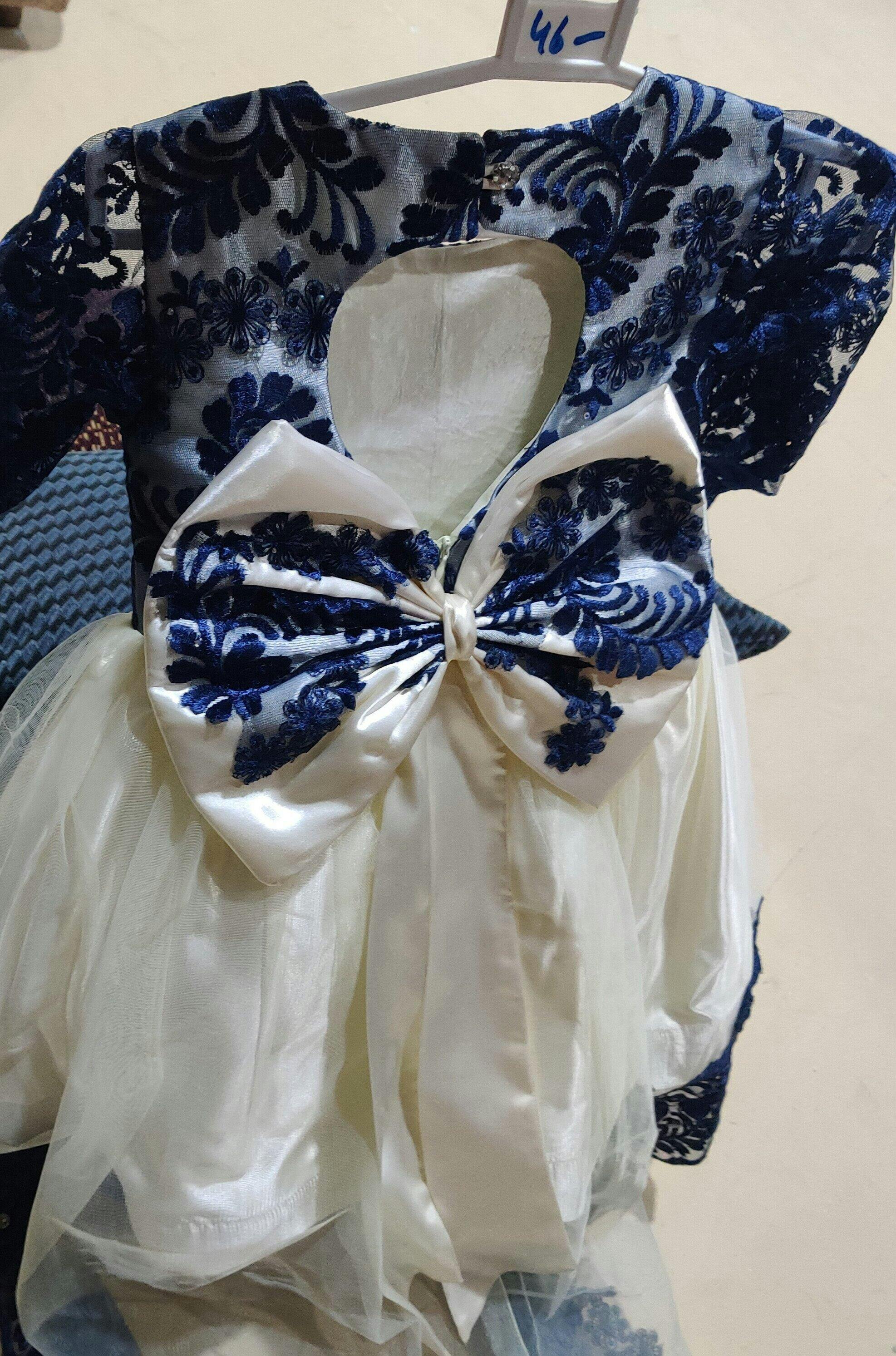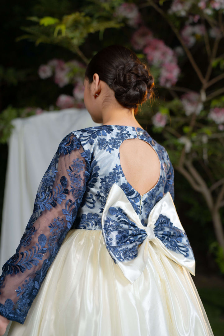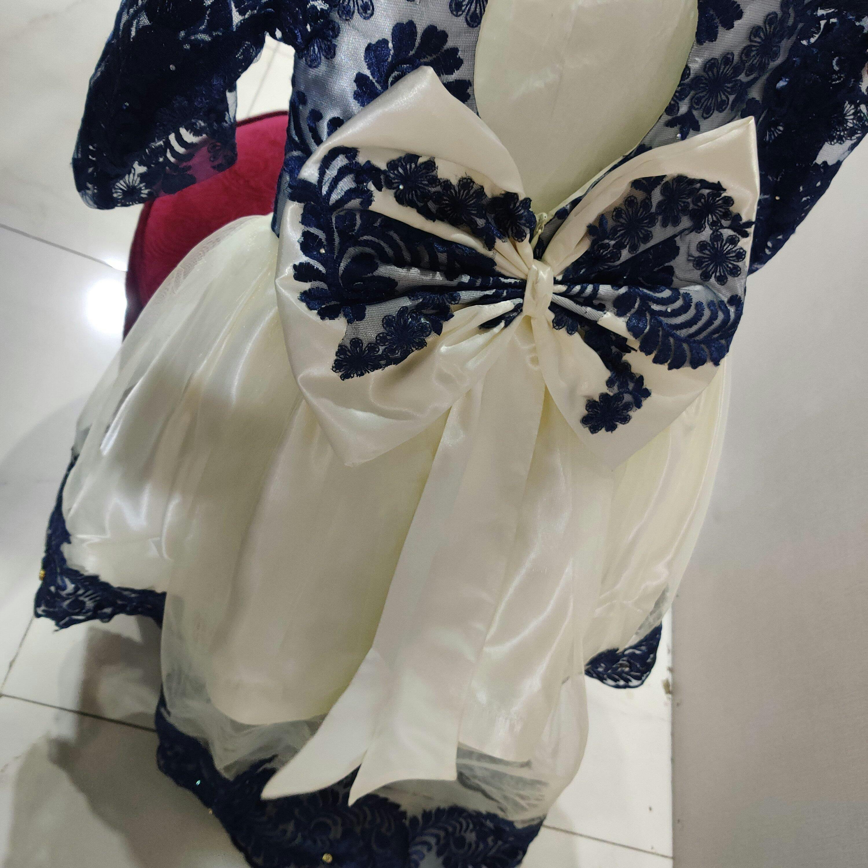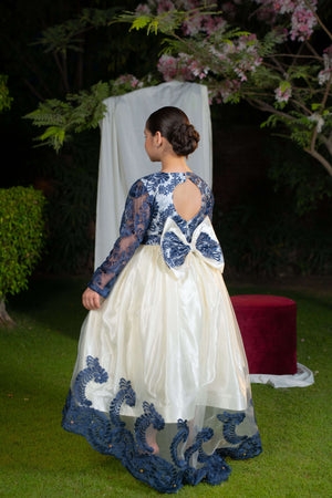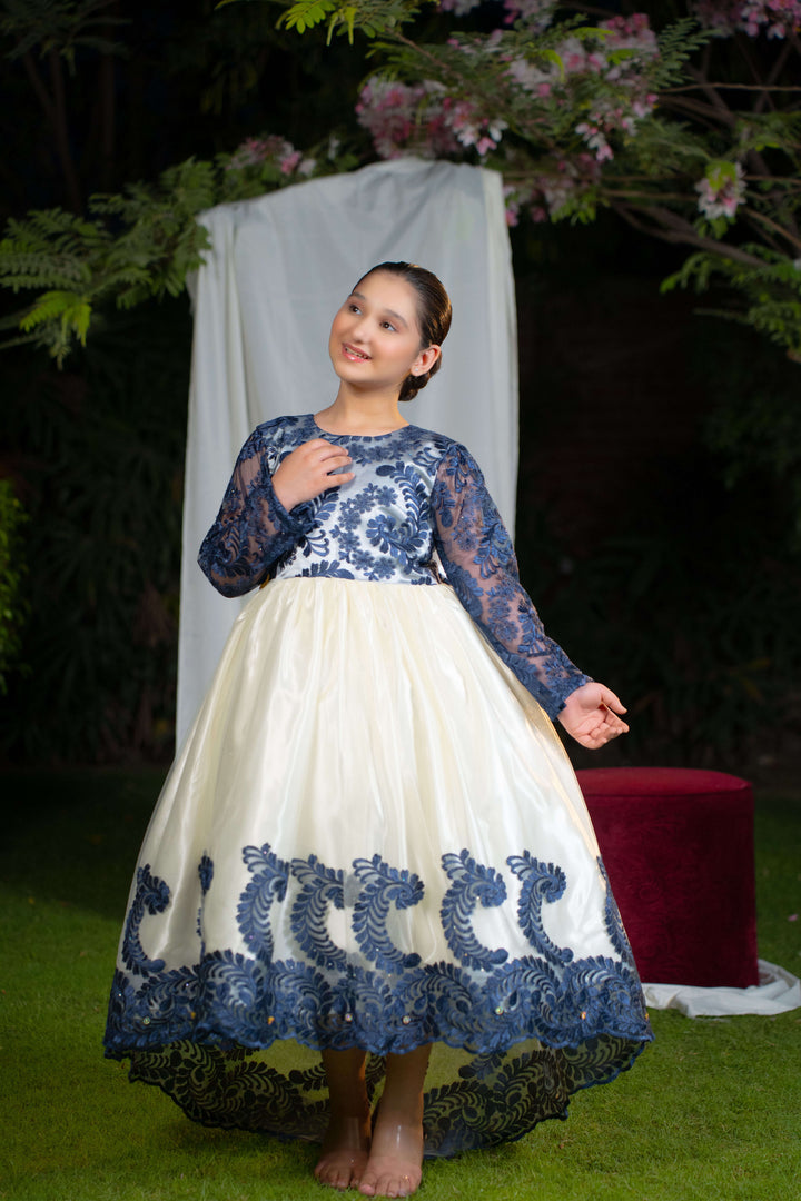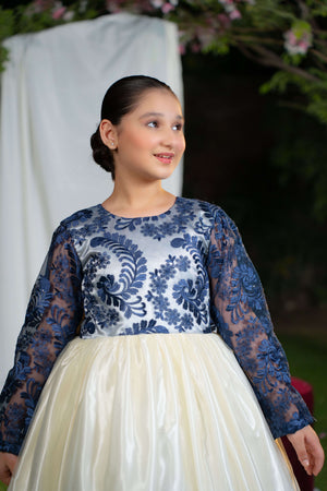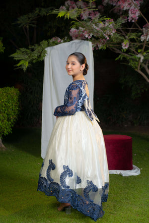 Description: A premium silk and net frock with navy blue embroidered bodice and sleeves, off-white net overlay, and soft silk lining. Designed with an elegant back tail and adjustable zip.